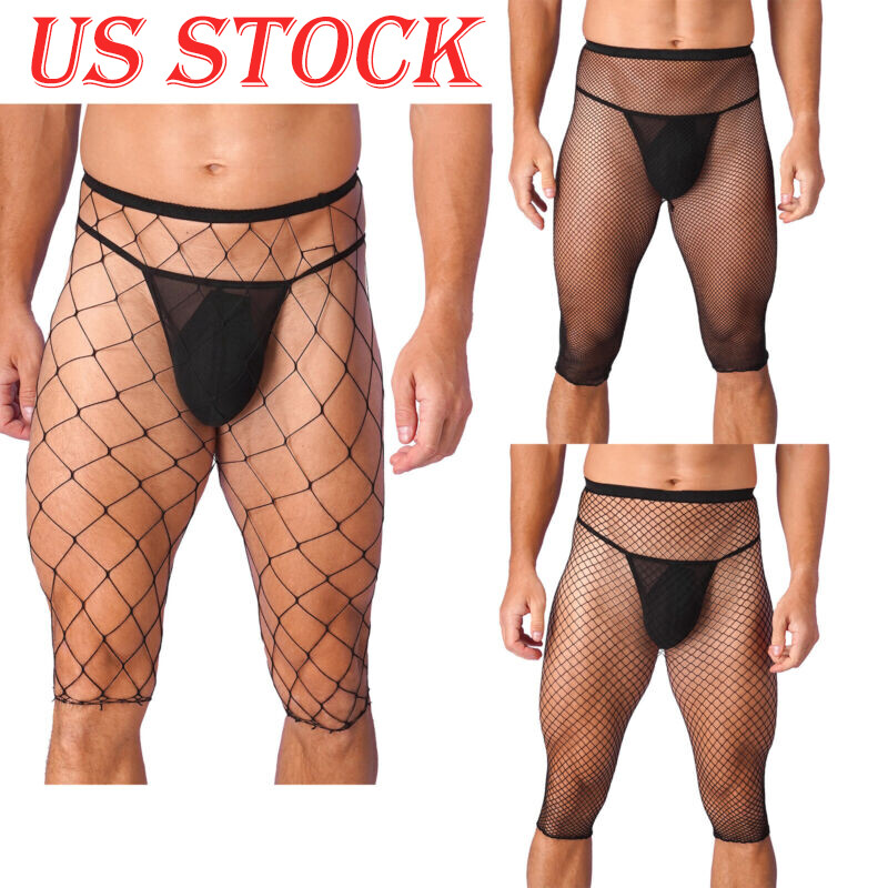Low rise with belt loops, front zippered bulge pouch, see through fishnet spliced design with adjustable buckle straps.