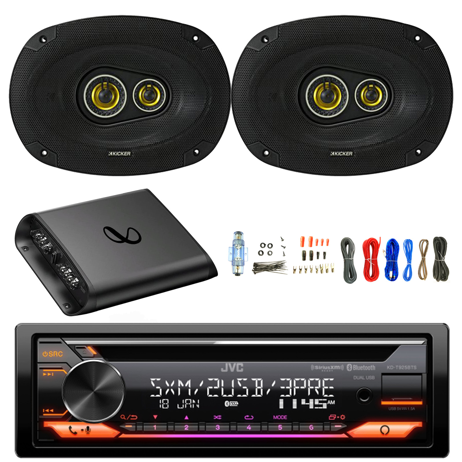 PACKAGE BUNDLE INCLUDES: JVC KD-T925BTS Single DIN USB AUX Bluetooth AM/FM Radio CD Player Stereo Receiver, 2x 6x9" 450 Watt Peak Power 3-Way Car Audio Speakers, 2-Channel Amplifier with Wiring Install Kit