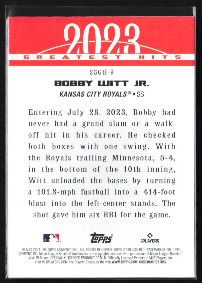 | 2024 Topps 2023 Greatest Hits Bobby Witt Jr. Kansas City Royals #23GH-9 | ||||||||||||||||||