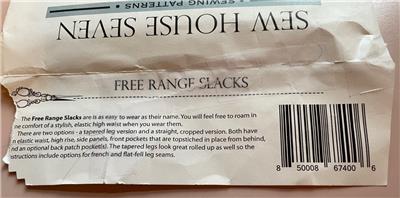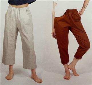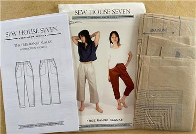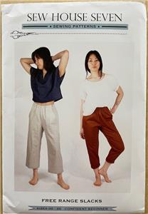 This listing is for a sewing pattern from Sew House Seven. This is 'Free Range Slacks' -- very comfortable, with elastic high waist, side panels, front pockets, and optional back patch pocket. Two leg options: tapered leg version and straight, cropped version. Contains full-size pattern pieces and detailed, illustrated instructions.