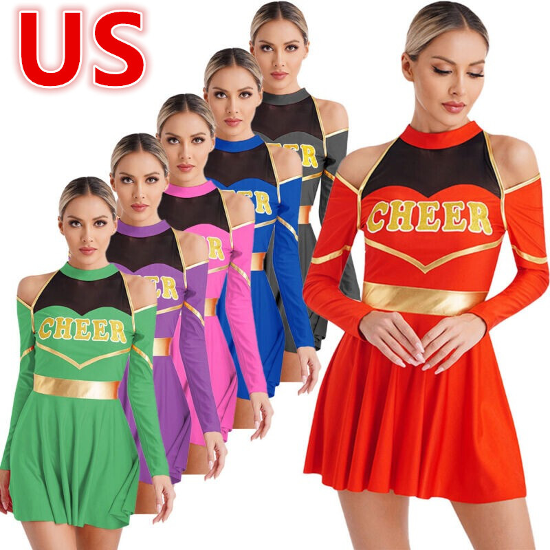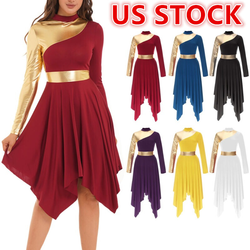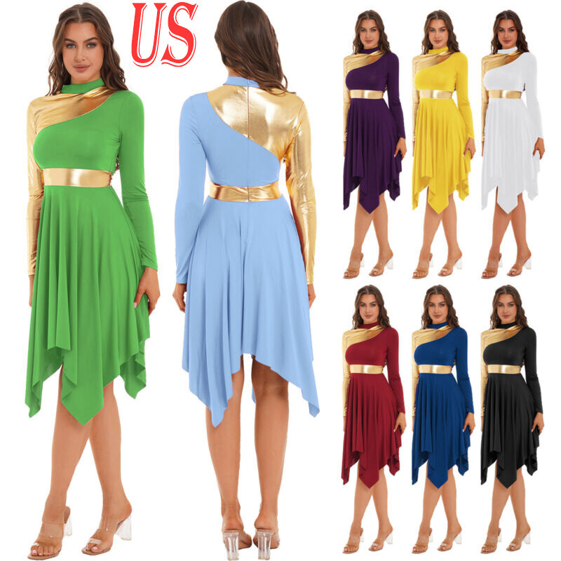 Long sleeve dance dress for women, mock neck, color block patchwork, back invisible zipper closure, easy to put on and off.
