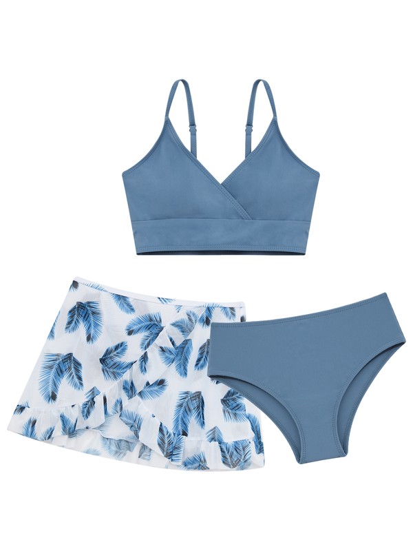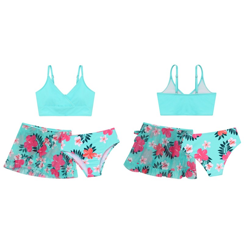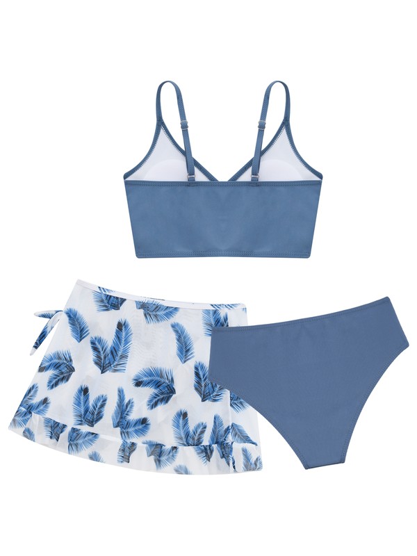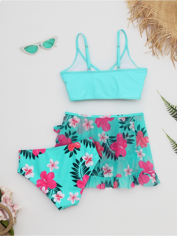 3Pcs of bikini top, bikini bottoms and cover up mesh skirt for girls, vivid floral print make girls more beautiful.