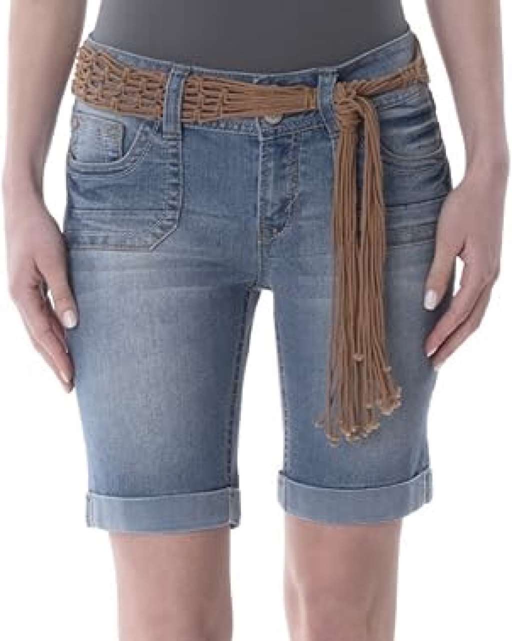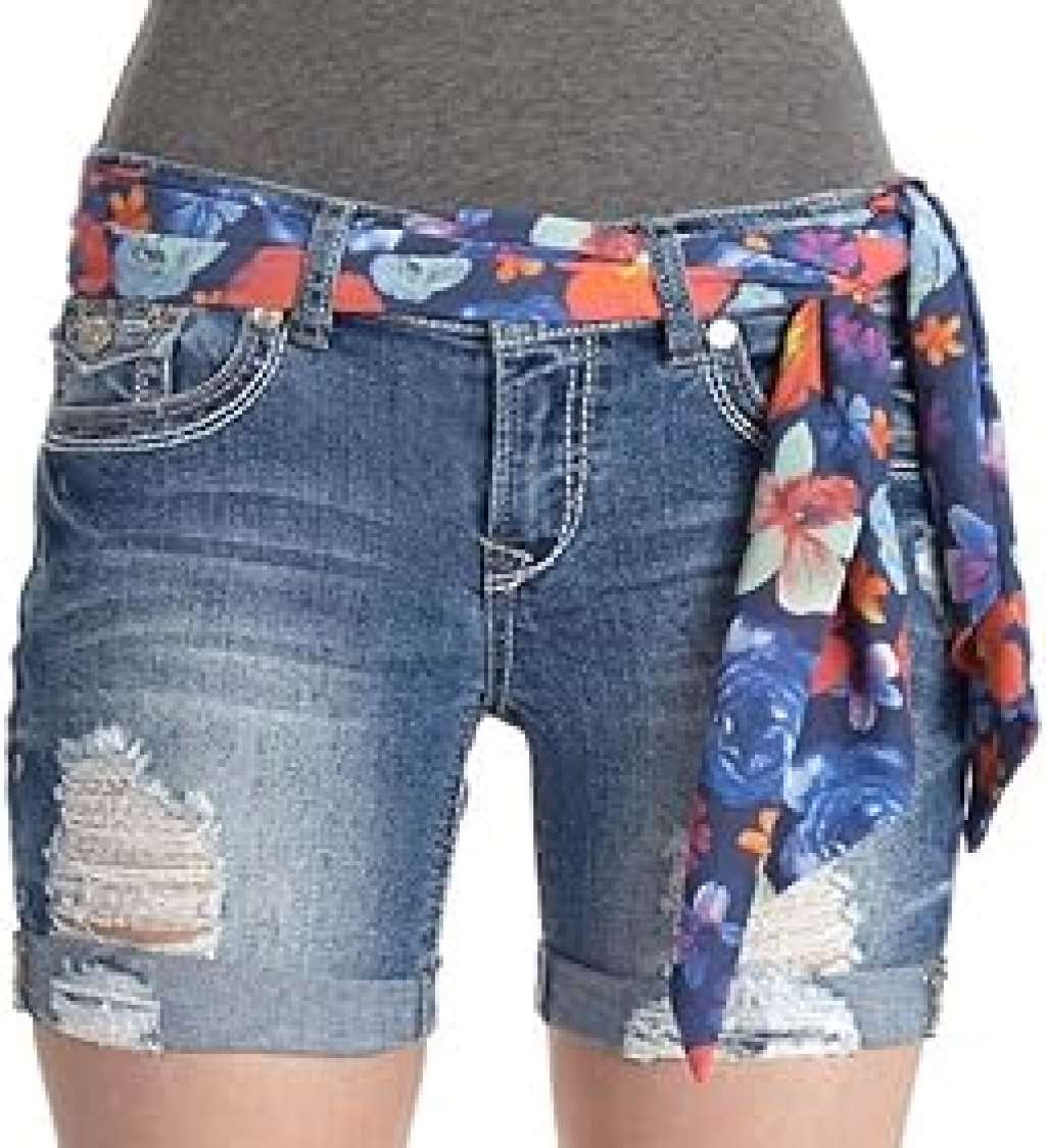Luscious Curvy denim shorts featuring a removable belt and chop pockets.