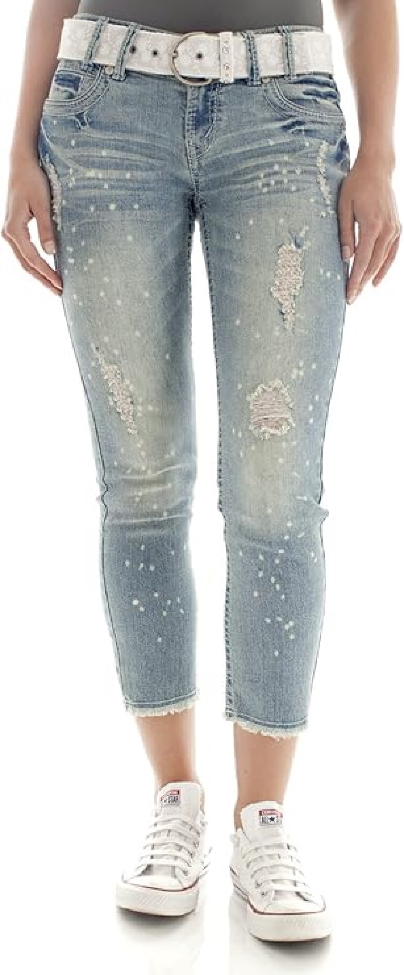 These cropped capri jeans include frayed hems signature embroidery and a removable belt.