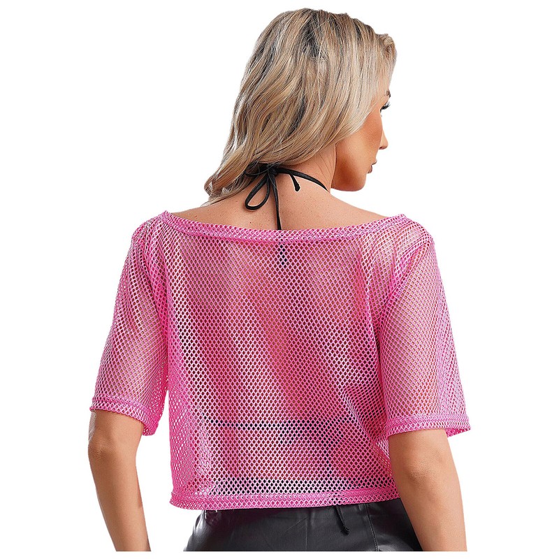 See-through mesh T-shirt works well with camisole, bra top, tank top, vest, jeans, shorts and skirts, creating a retro 1980s disco look.