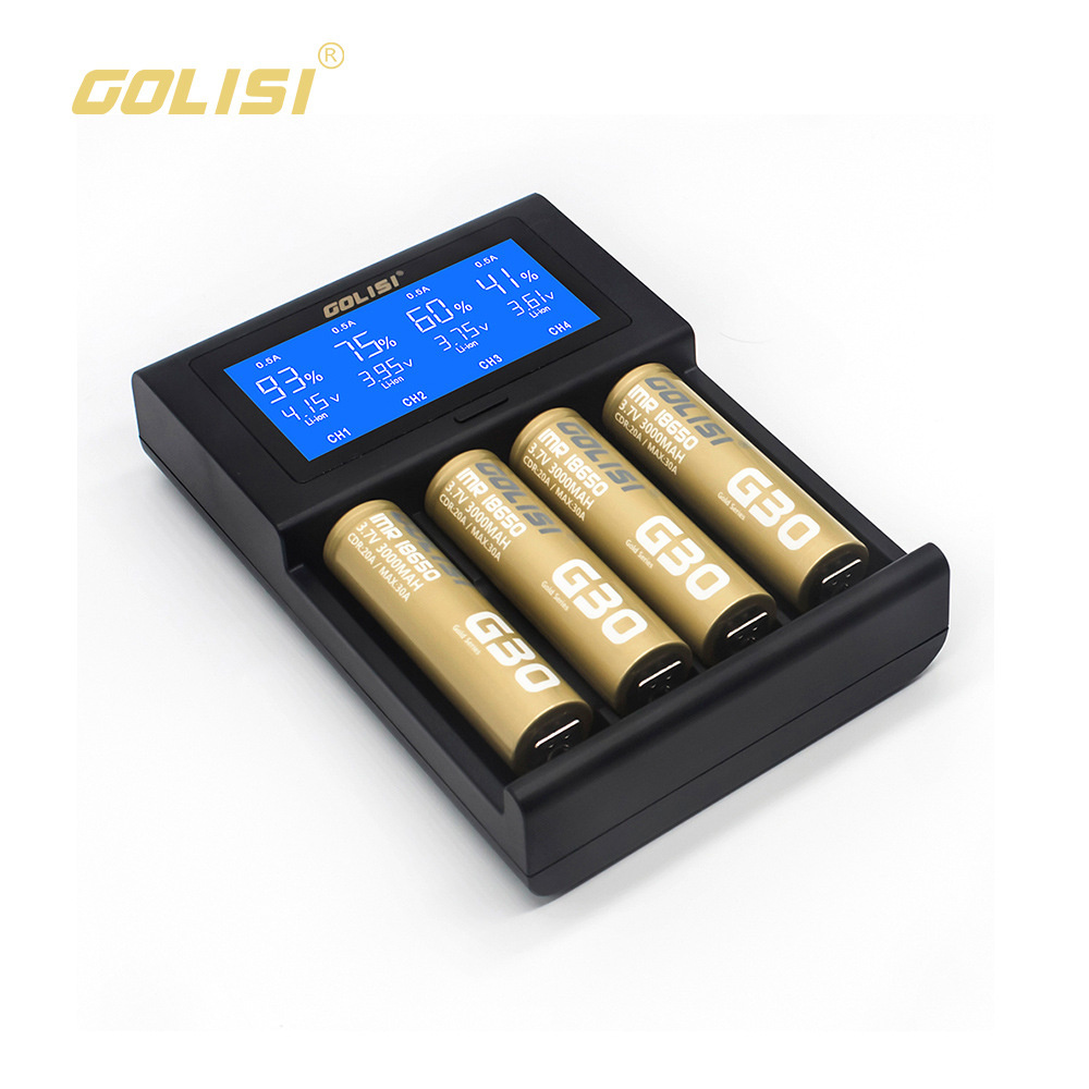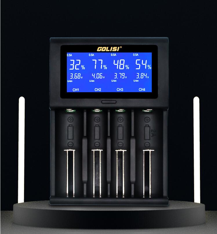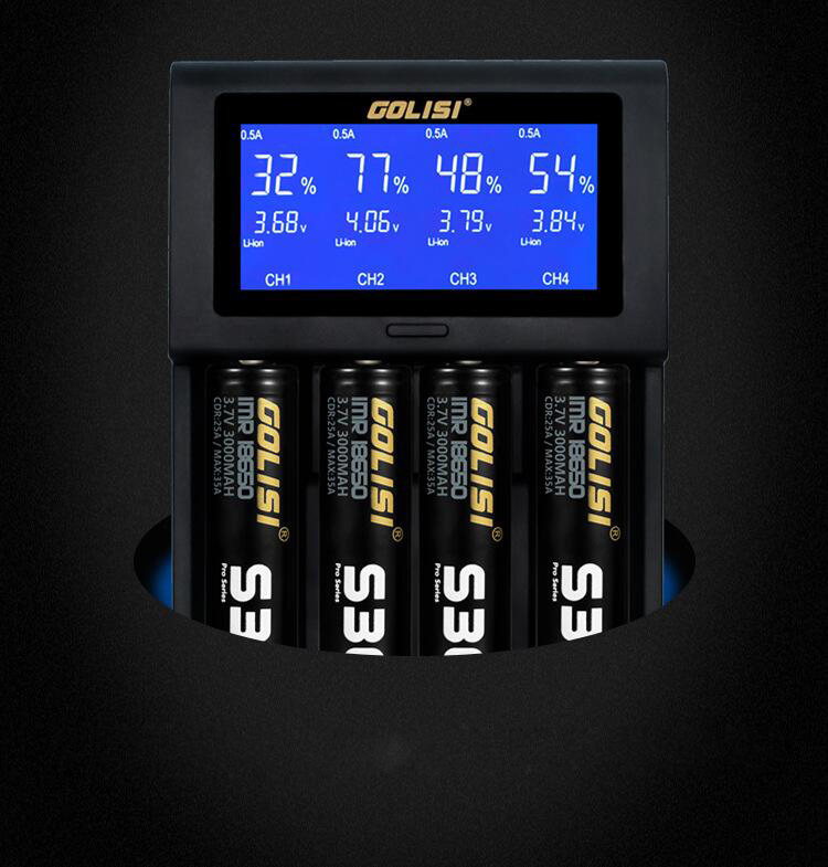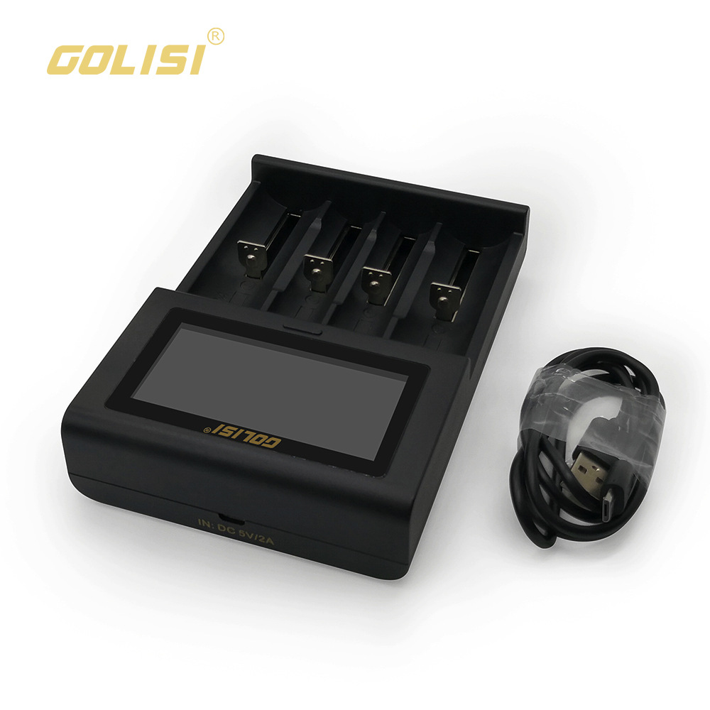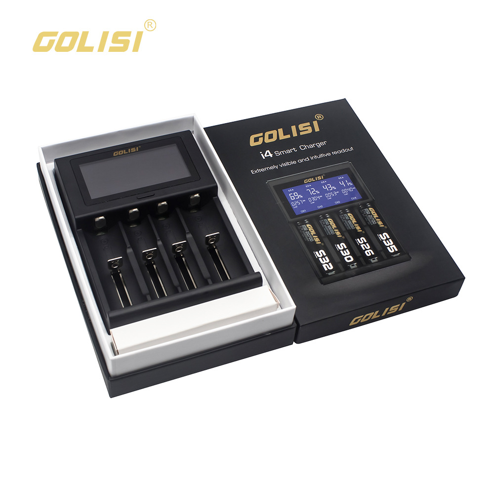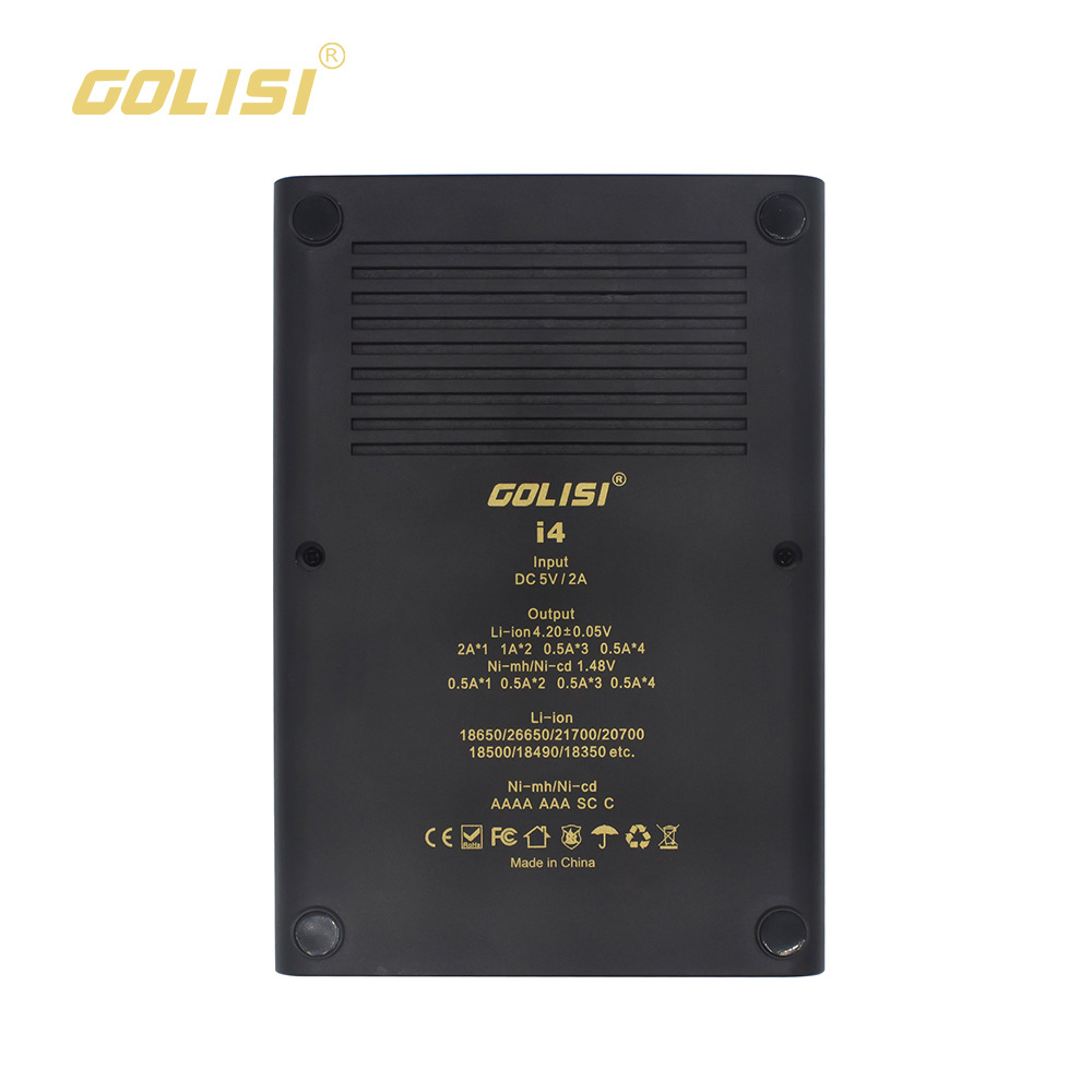 Specifications: Input: DC 5V /2A Safety Protections: DV Detection; ODV Detection; Total Time Control; Highest Voltage Detection Idling Output Voltage: 5V Input current: Li-ion 2000MA*1 / 1000MA*2 / 500MA*3 / 500MA*4 NiMH 1.2V 500MA*1 / 500MA*2 / 500MA*3 / 500MA*4 Protection Mode: Short Circuit Protection; Over-Current Protection; Reverse Connection Protection Case Material: ABS +PC, temper proof material Loading spring: Military grade spring Working Temperature : 0-40 Celsius LCD display and Operation: Connecting to power supply without loading batteries, the LCD screen will be bright for 2 seconds then displays “null” which means no batteries being loaded Charging Status VS Screen Display: loading batteries, the screen displays channel /battery voltage / charging current / capacity rates. “%” flashes while i2 device is charging, “%” increases until 100% which means batteries are fully charged, i2 cease charging. Button Operation: Click the button to check related information of batteries, including voltage / capacity / time. A long click can keep the screen constantly bright. Connecting to Power Supply, without batteries, the screen will be bright for 2 seconds then display “null” which denotes no batteries being loaded Charging Status and Screen Display: loading batteries, the screen will display channel / battery type / battery voltage / charging current / capacity rate. “%” flashes mean the device is charging, “%” increases until 100% which means batteries are fully charged, I4 cease charging the battery. Button Operation: 3-second long click to turn on or turn off the LCD display. A soft tap displays the batteries' charging status including voltage / capacity / time Pakage Included: 1 x GOLISI i4 LCD Battery Charger 1 x USB Cable 1 x User manul 1 x Box