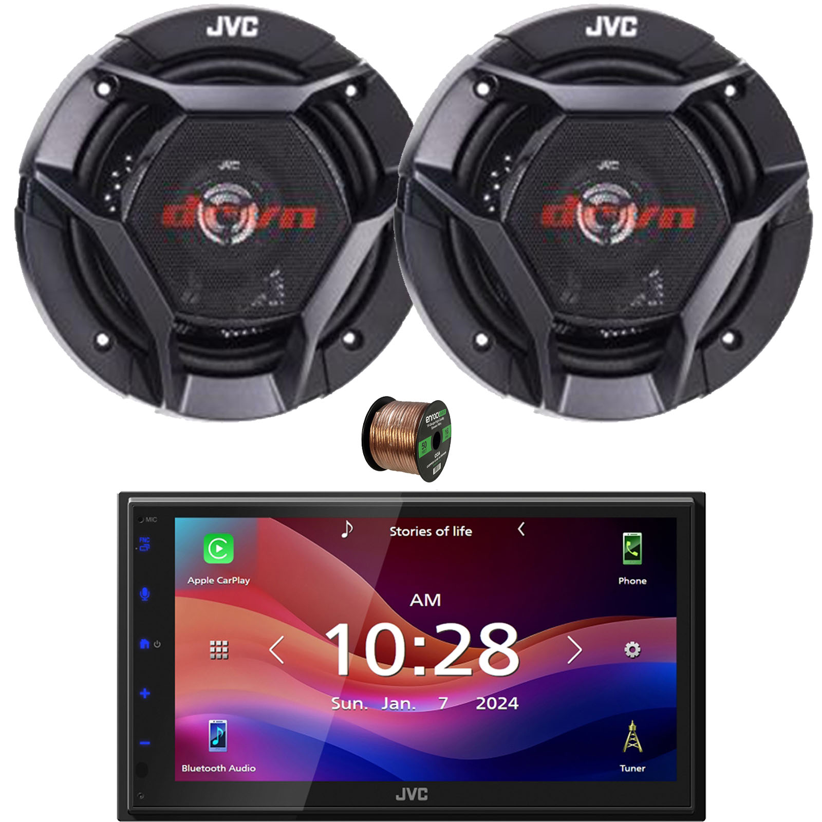 PACKAGE BUNDLE INCLUDES: JVC KW-M590BT Double-DIN 6.8" Capacitive Touchscreen Digital Media Bluetooth USB AM/FM Radio Car Audio Receiver, 2x JVC CS-DR621 drvn DR Series 6.5" 300W Max Power 2-Way Coaxial Automotive Speakers, 50 Feet 16 Gauge Speaker Wire