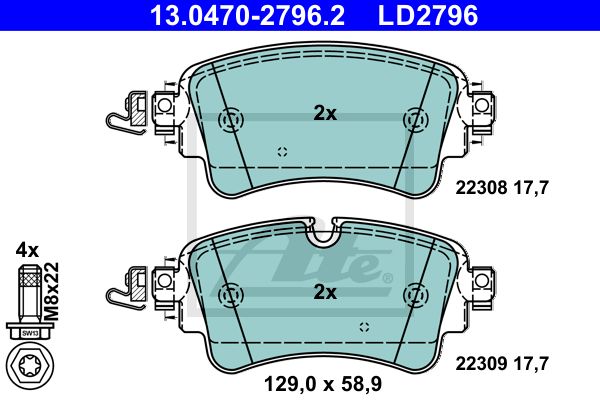 Bremsbelagsatz, Scheibenbremse EAN 2 : 4006633460224 Herstellnummer 2 : 13.0470-2796.2 Dicke/Stärke [mm] : 17,7 Prüfzeichen : E1 90R-02A0258/0217 Breite [mm] : 129,0 Höhe [mm] : 58,9 Verschleißwarnkontakt : für Verschleißwarnanzeiger vorbereitet,exkl. Verschleißwarnkontakt Bremssystem : Lucas / TRW Ergänzungsartikel/Ergänzende Info 2 : mit Bremssattelschrauben Anzahl der Schrauben : 4 Artikelnummer des empfohlenen Zubehörs : 24.8190-0964.2,24.8190-0969.2,24.8190-0990.2 MAPP-Code vorhanden : MAPP-Code vorhanden