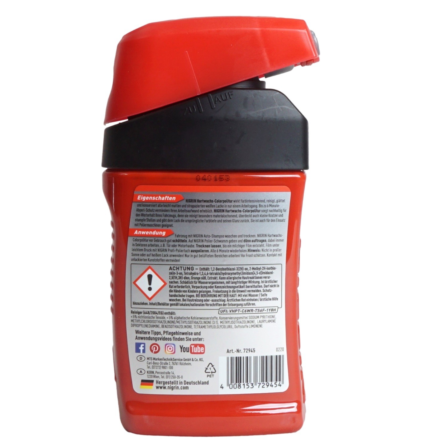 NIGRIN Hartwachs-Colorpolitur sorgt nachhaltig für den Werterhalt Ihres Fahrzeugs, denn sie reinigt besonders materialschonend, überdeckt auch kleine Kratzer und stumpfe Stellen und gibt dem Lack die ursprüngliche Farbtiefe und seinen Glanz zurück.