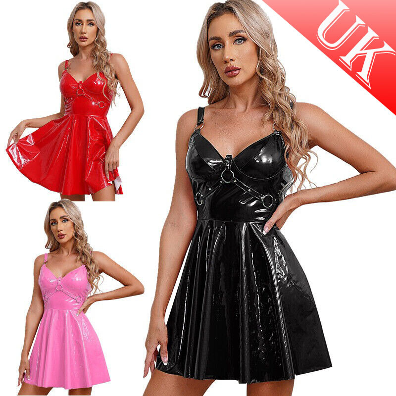 Womens Glossy Patent Leather Flared Skirt Invisible Zipper A-Line Mini Skirts.