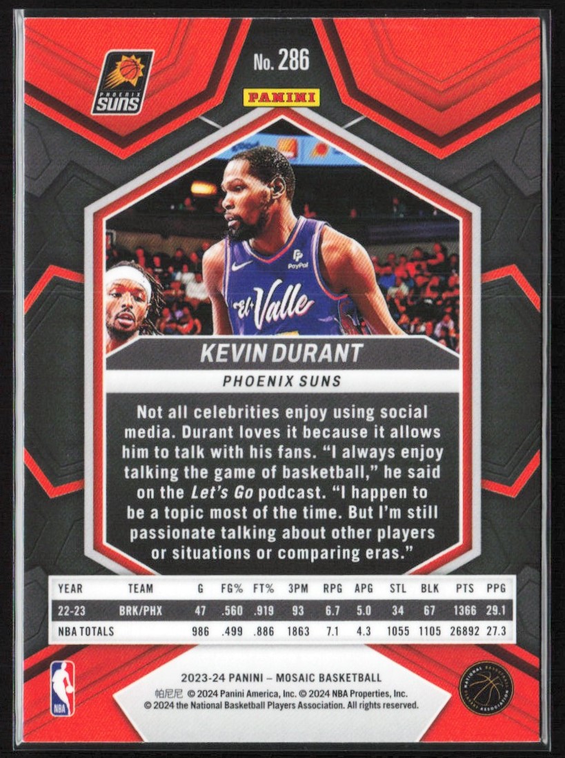 | 2023-24 Panini Mosaic Base City Edition Kevin Durant Phoenix Suns #286 | ||||||||||||||||||