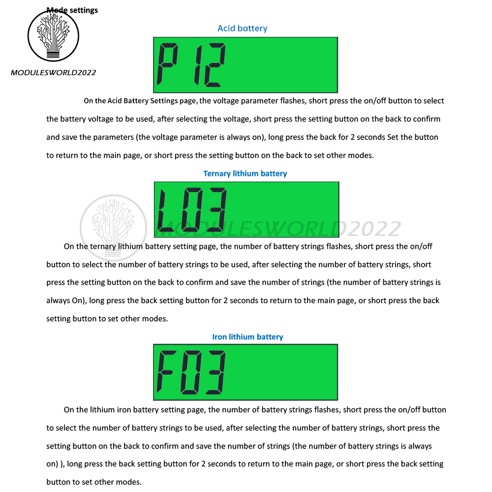 There are two types of lithium batteries (ternary lithium L and iron lithium F), let's distinguish them; Firstly, fully charge the battery. The saturation voltage of a ternary lithium battery string is DC4.2V, and the saturation voltage of an iron lithium battery string is DC3.6V; For example, the saturation voltage display is 29.4V (7 strings), which is a ternary lithium battery. Then select the parameters according to the setting mode of the ternary lithium battery.