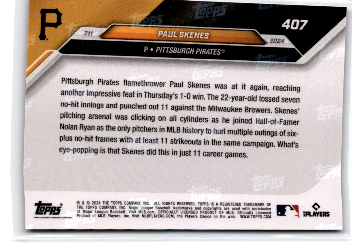 2024 Topps Now 7.11 Paul Skenes Joins Nolan Ryan Rookie Paul Skenes Pittsburgh