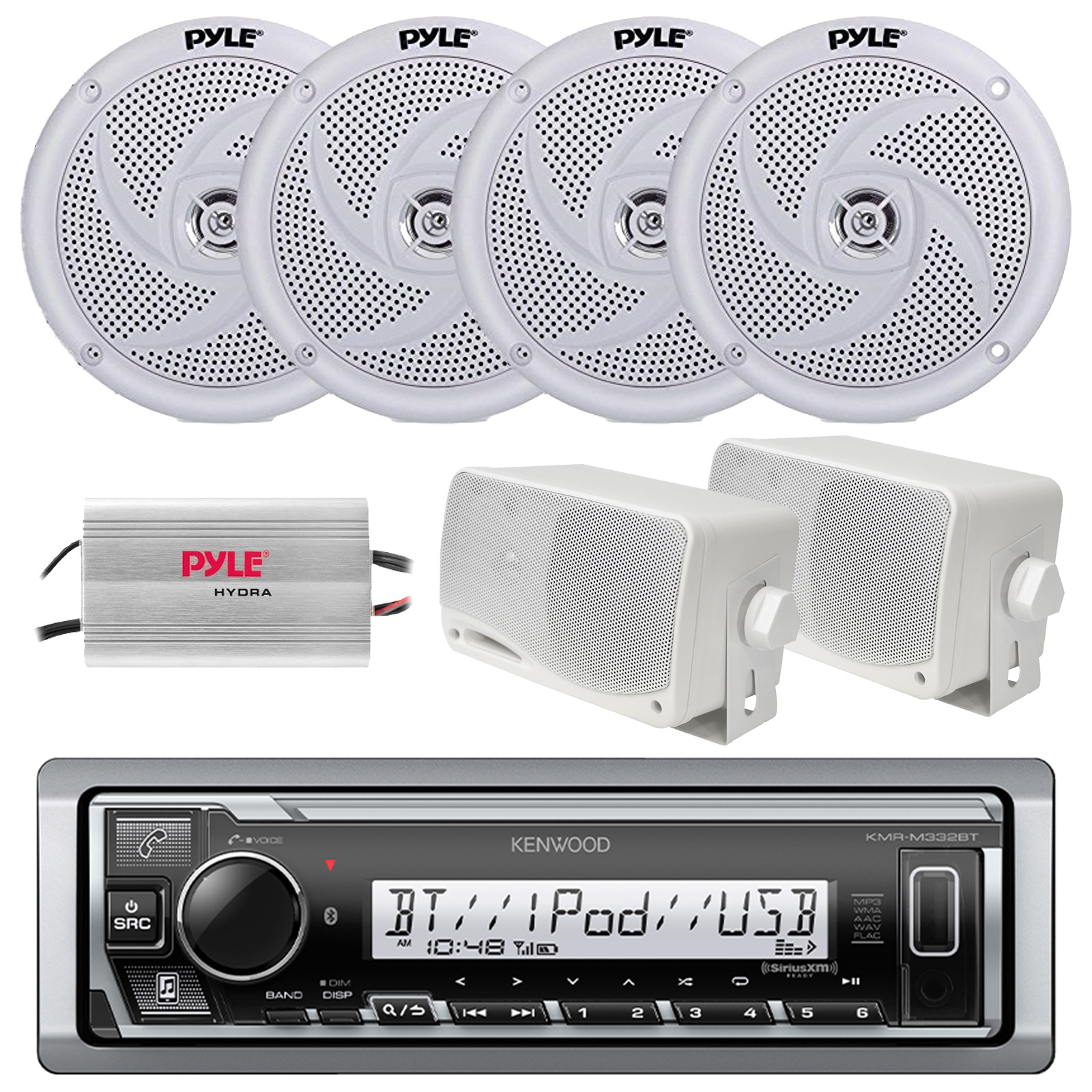 PACKAGE BUNDLE INCLUDES: Kenwood KMR-M332BT Single DIN Marine Bluetooth AM/FM Stereo Receiver, 4x 5.25" 180 Watt 2-Way Low Profile Slim Style Audio White Speakers, 2x 3.5'' 200 Watt 3-Way White Speakers , 4-Channel Amplifier