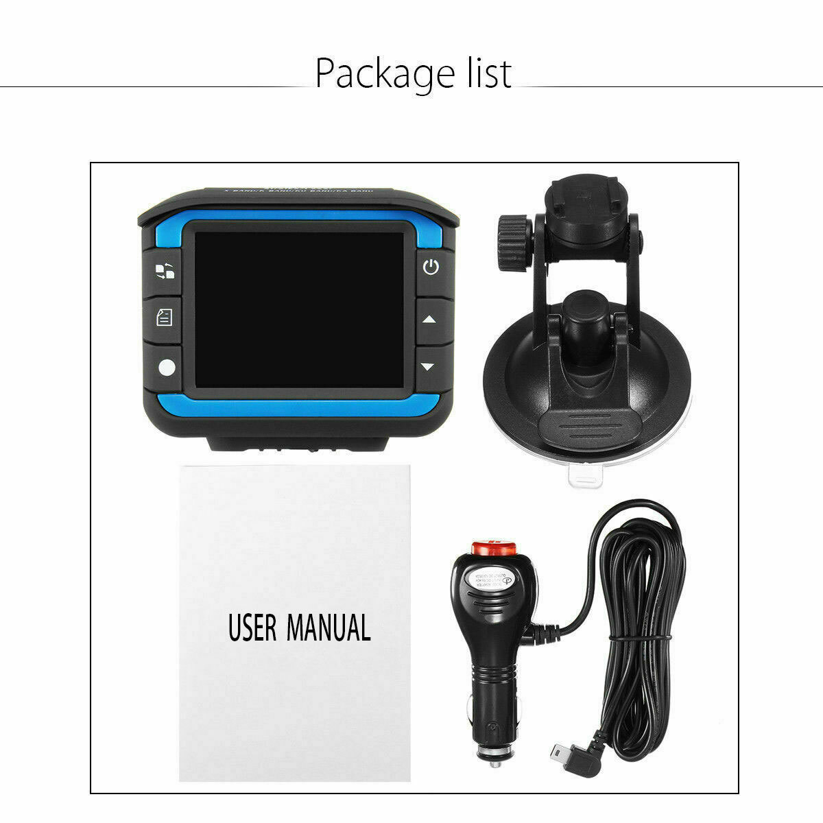 Packing included: car dvr, car charger, suction cup, manual