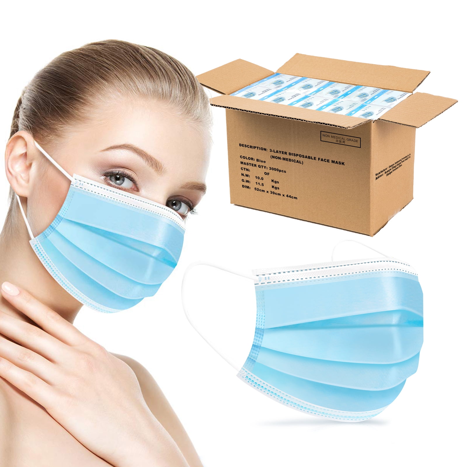 3000 Pcs Disposable Face Mask Adults Face Mask 3Ply Blue with Ear Loop
