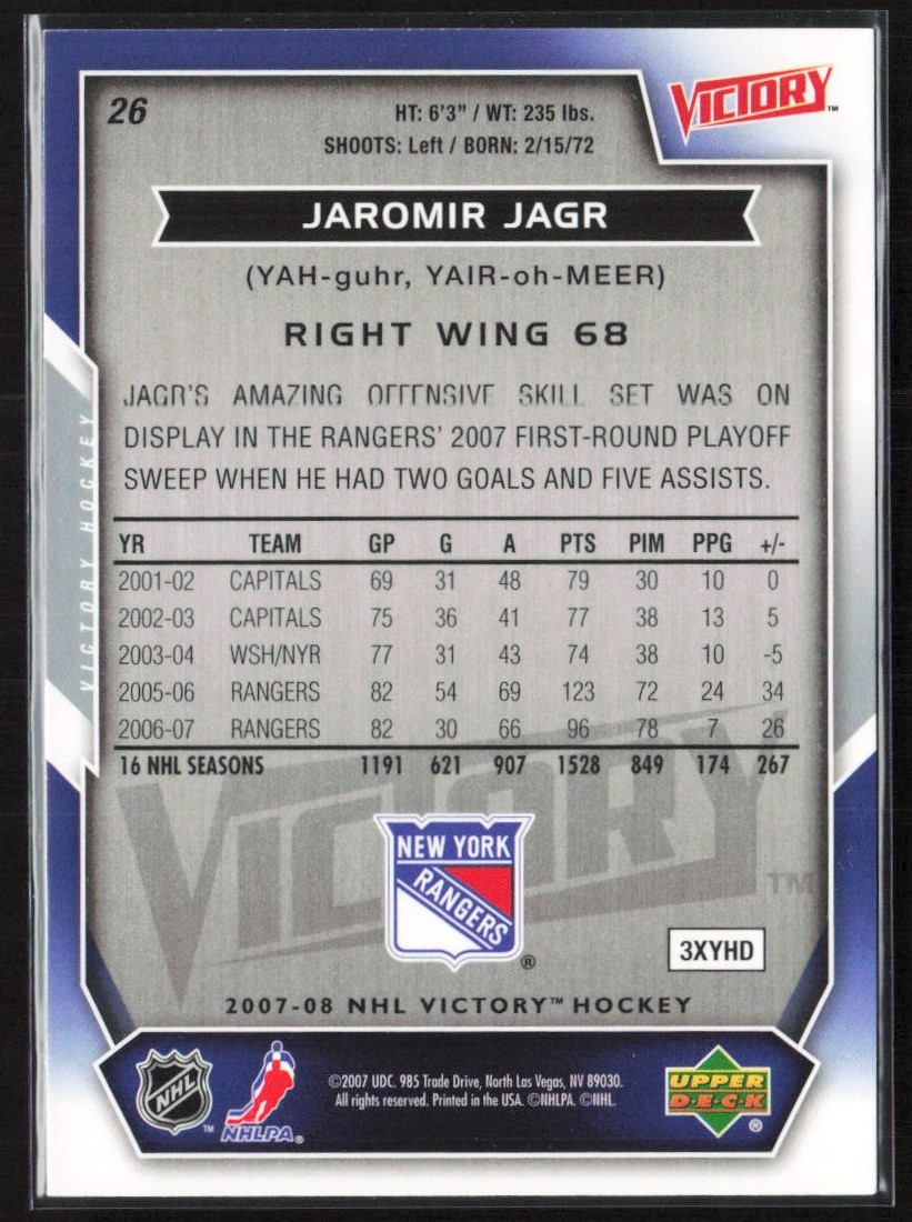 | 2007-08 Upper Deck Victory Jaromir Jagr New York Rangers #26 | ||||||||||||||||