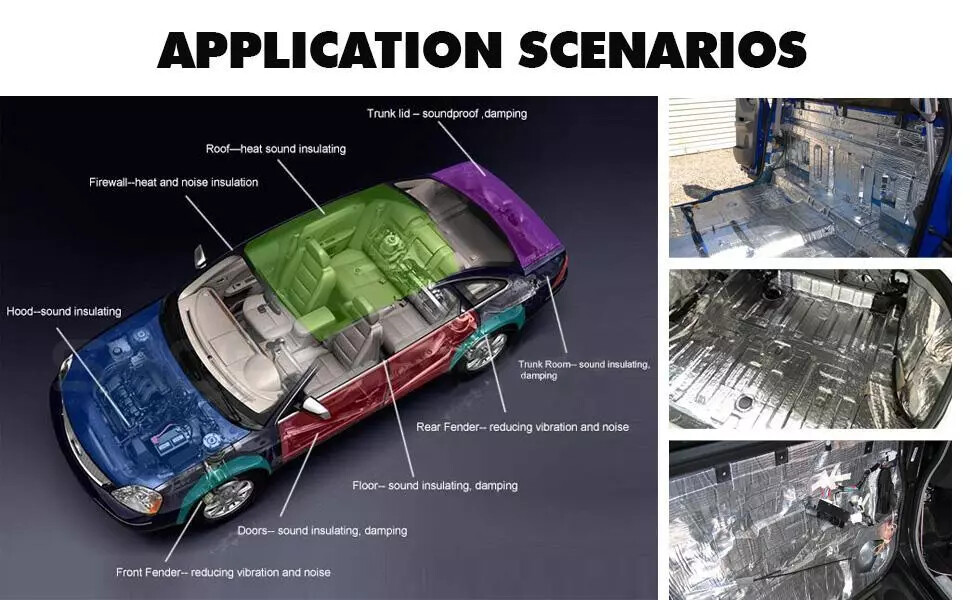 Adhesive backing Applications: Exterior bulkhead, firewall, hood, engine compartment, engine bays. Boot, wheel arch, body panels, load floor, under seat, floor, interior bulkhead. Also ideal for under floor applications as it has great load resistance properties. Package include: - 10pcs x 15.7"x9.8" sound deadening