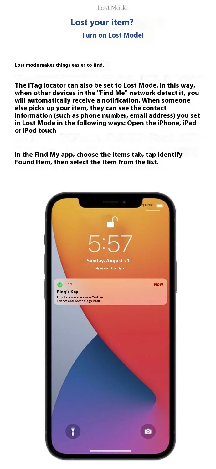 The iTag locator can also be set to Lost Mode. In this way,when other devices in the "Find Me" network detect it,