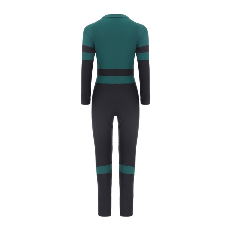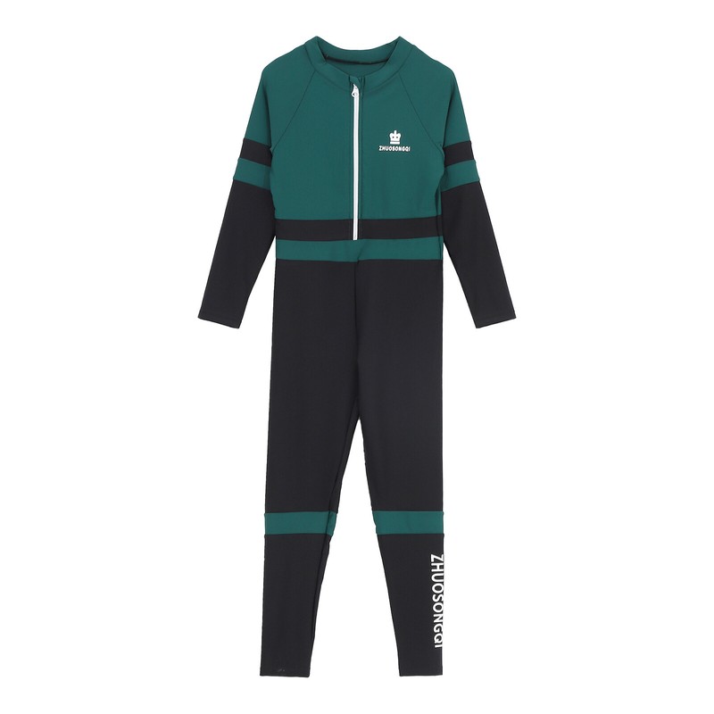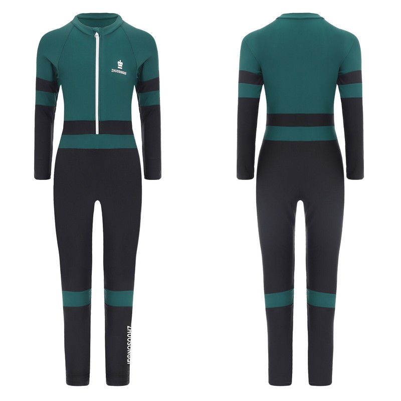 An one piece athletic swimsuit for boy, mock neck, long sleeve, full body swimwear with front lined zipper closure.