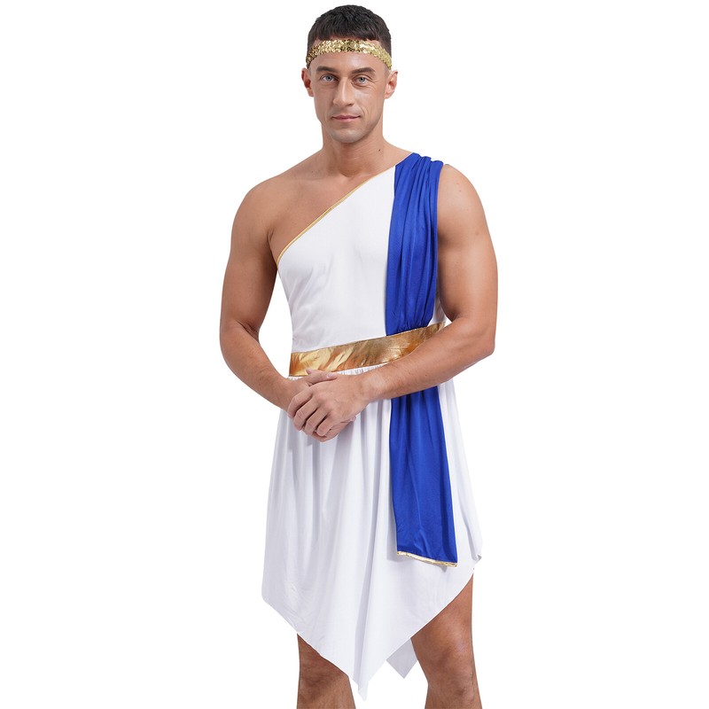 Sleeveless dress for men, featuring with color block drape, one shoulder, gold metallic fabric around the waist, making you look cool.