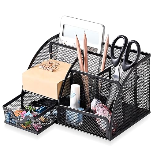 Mesh Desk Organizer, Desktop Organizer with Drawer, Office Supplies Multi-Functional Caddy, Metal Stationary Black Desk Caddy, with 6 Compartments and 1 Drawer for Home, School, Workshop, kitchen