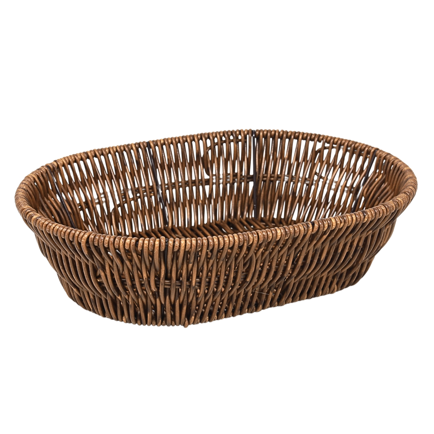 This plastic basket is designed to resemble a woven wicker basket. Despite being made from plastic, it mimics the natural look of traditional wicker, offering durability and ease of maintenance. A plastic woven wicker basket provides the appearance of conventional wicker but with the durability and practicality of plastic.