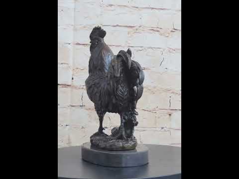 Elevate your space with this captivating bronze sculpture, a testament to the artist's impeccable skill and craftsmanship. The carefully applied brown patina finish serves as both a protective layer and an aesthetic enhancement, preserving the intricate details of the sculpture while adding a touch of antiquity and sophistication to its overall appearance. Mounted on a sleek black marble base, the sculpture bears the European Bronze Finery stamp of quality, attesting to its exceptional craftsmanship and artistic merit. The distinguished presence of the artist Milo's signature further solidifies the sculpture's status as a collectible masterpiece, inviting viewers to immerse themselves in the rich symbolism and timeless allure of this majestic rooster.