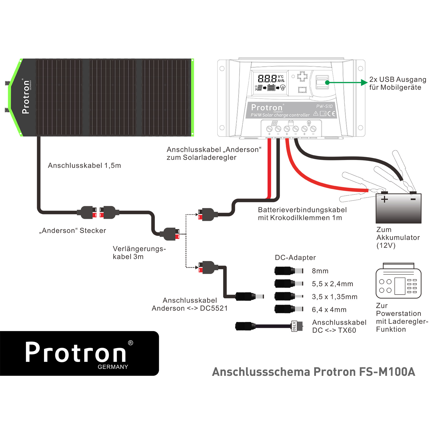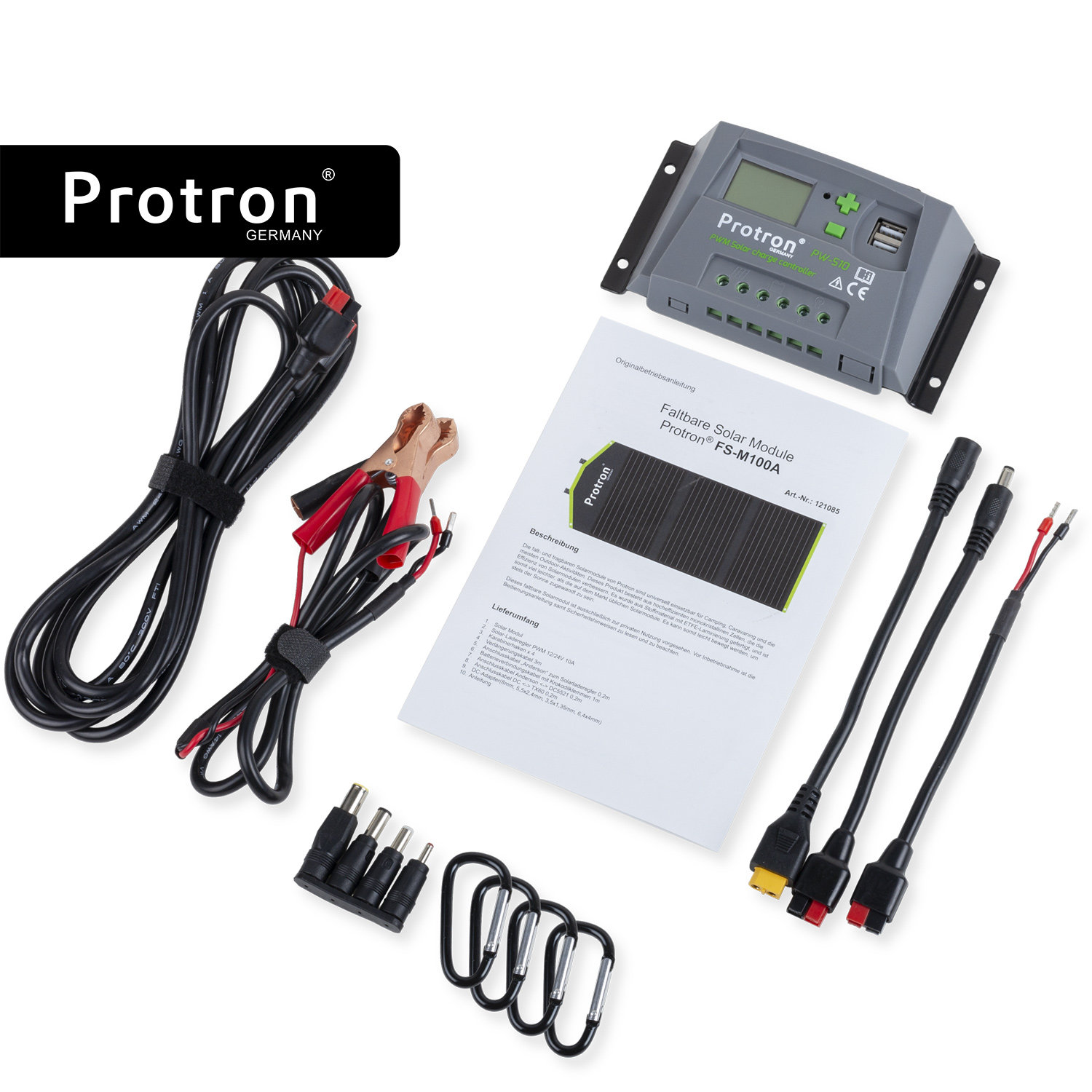 Protron® - Faltbares 100W PERC Mono-Kristallin Photovoltaik Solarpanel - Komplettset mit Laderegler PWM 12/24V 10A und zahreichem Zubehör