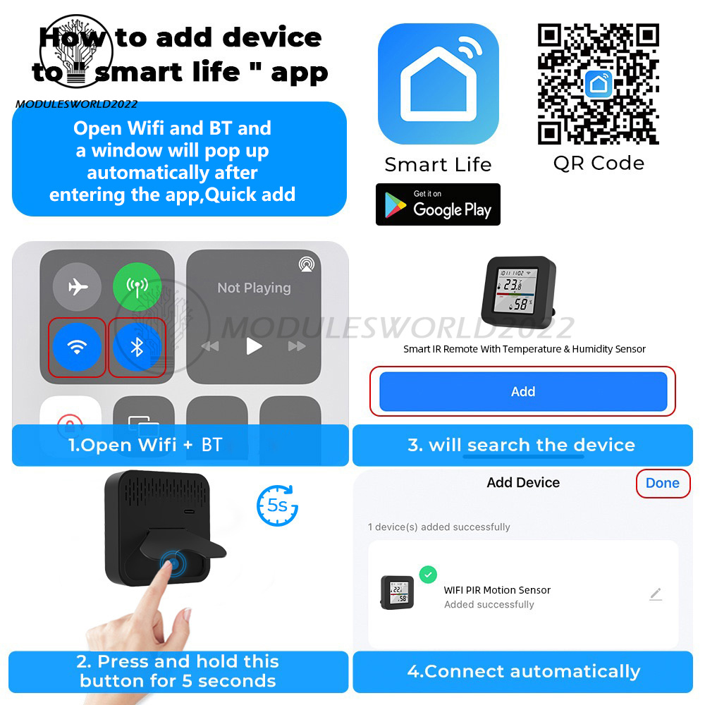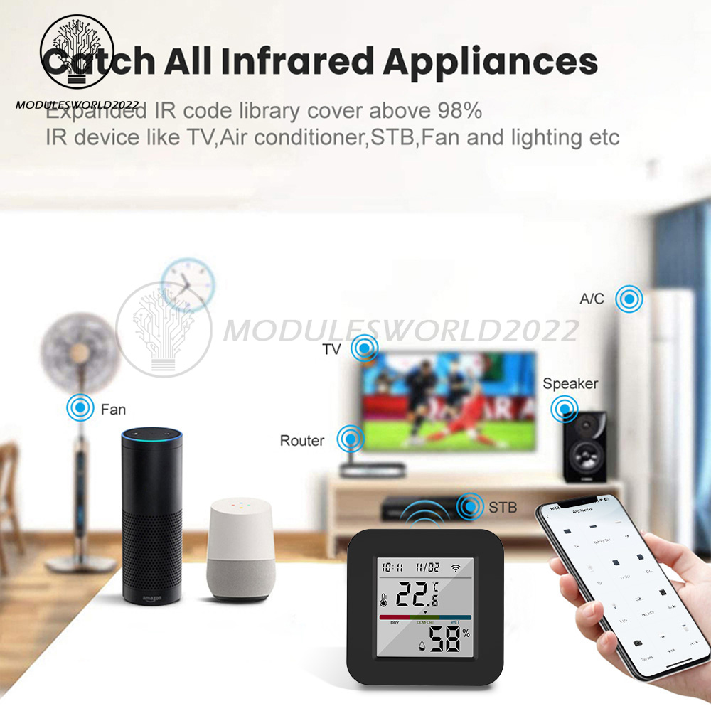 【3-in-1】 IR remote control + temperature + humidity three functions integrated together. You can control these devices remotely with just one click on the mobile app.