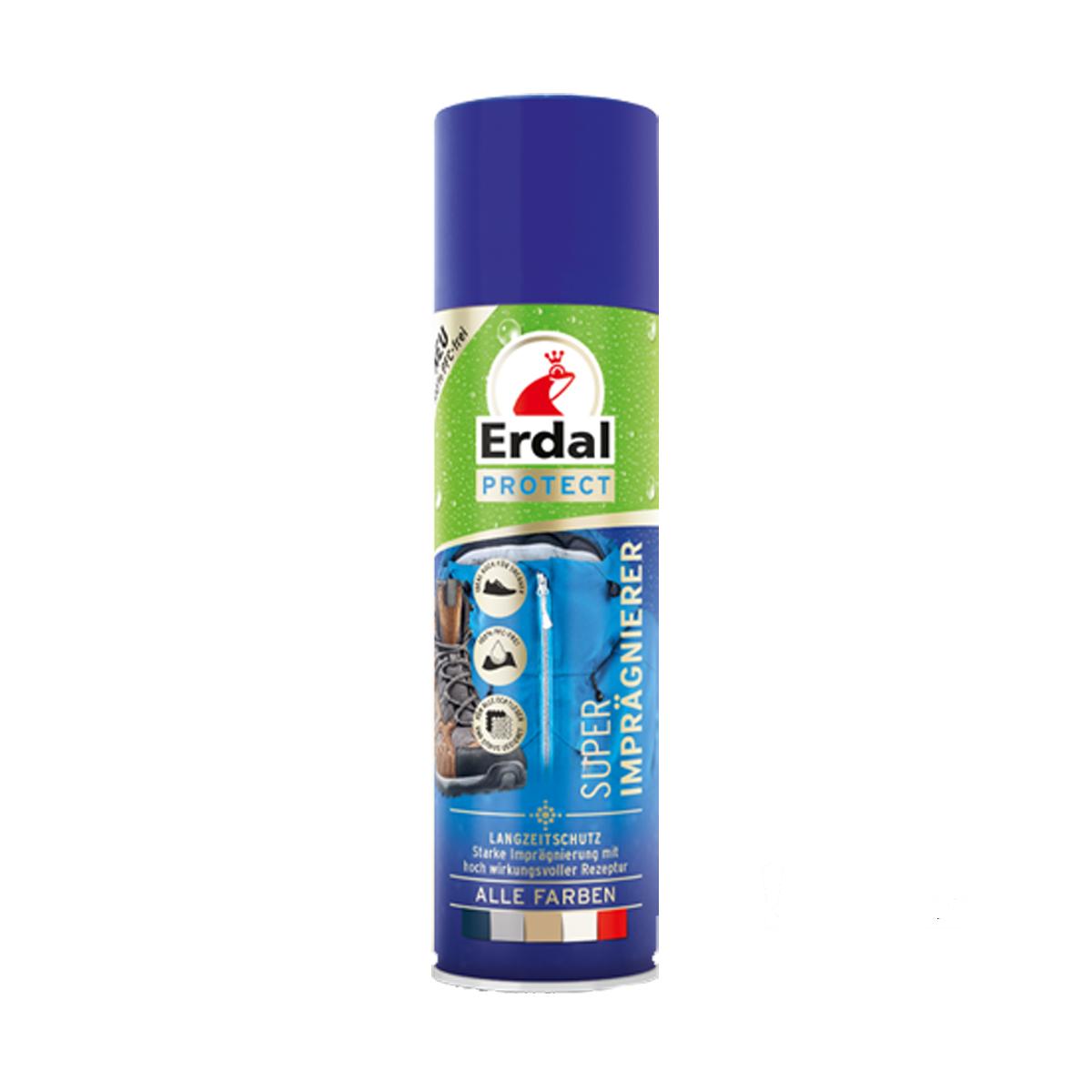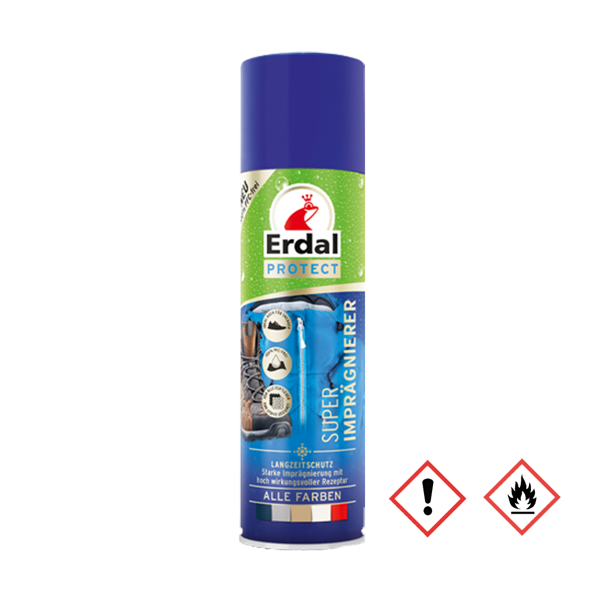 Erdal Super-Impregnator 300ml - Care product - Manufacturer: Werner & Mertz GmbH, Rheinallee 96, 55120 Mainz --- --- Signal word: DANGER --- P102 - Keep out of reach of children.P210 - away from heat/sparks/ Keep away from open flames/hot surfaces.No smoking.P211 - Do not spray on open flames or other sources of ignition.P251 - Pressurized container: do not puncture or burn, even after use.P261 - Inhalation of dust/smoke/gas/mist /Avoid vapor/aerosol.P312 - If you feel unwell, call a POISON CENTER or doctor/pharmacy.P410+P412 - Protect from sunlight and do not expose to temperatures exceeding 50°C.P501 - Dispose of contents/container to an approved waste disposal facility --- H229 - Container under pressure:May burst if heated.H315 - Causes skin irritation.H319 - Causes serious eye irritation.H336 - May cause drowsiness or dizziness.H412 - Harmful to aquatic life with long lasting effects