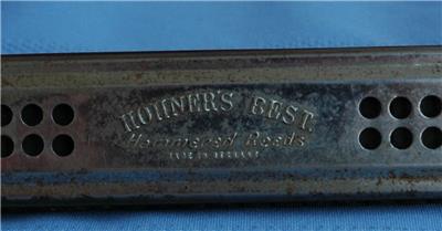 Offered for sale is an Antique Hohner Harmonica - "Hohner's Best, Hammered Reeds" - I am unsure of the age, but this one looks quite old - there is some surface rust as seen in photos - no box - otherwise in nice condition - length is 9"