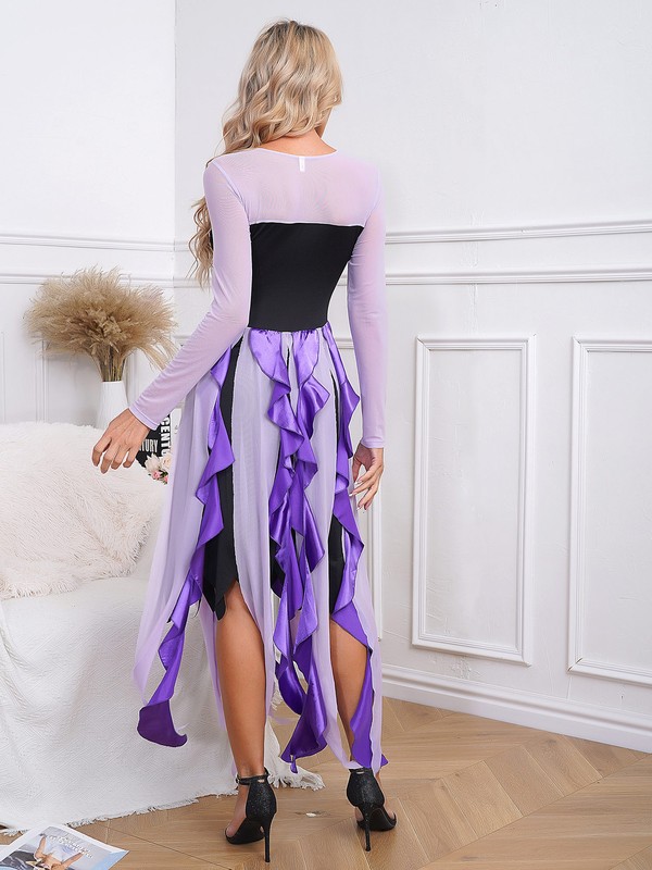 Designed with long sleeve, scoop neck and sweetheart illusion, cascading ruffle and asymmetrical hem, pullover style, contrast coplasy dress.