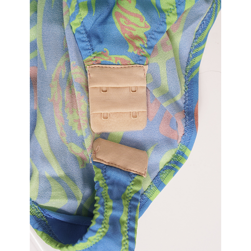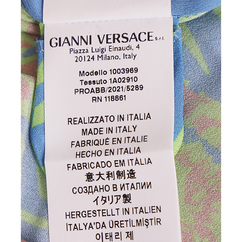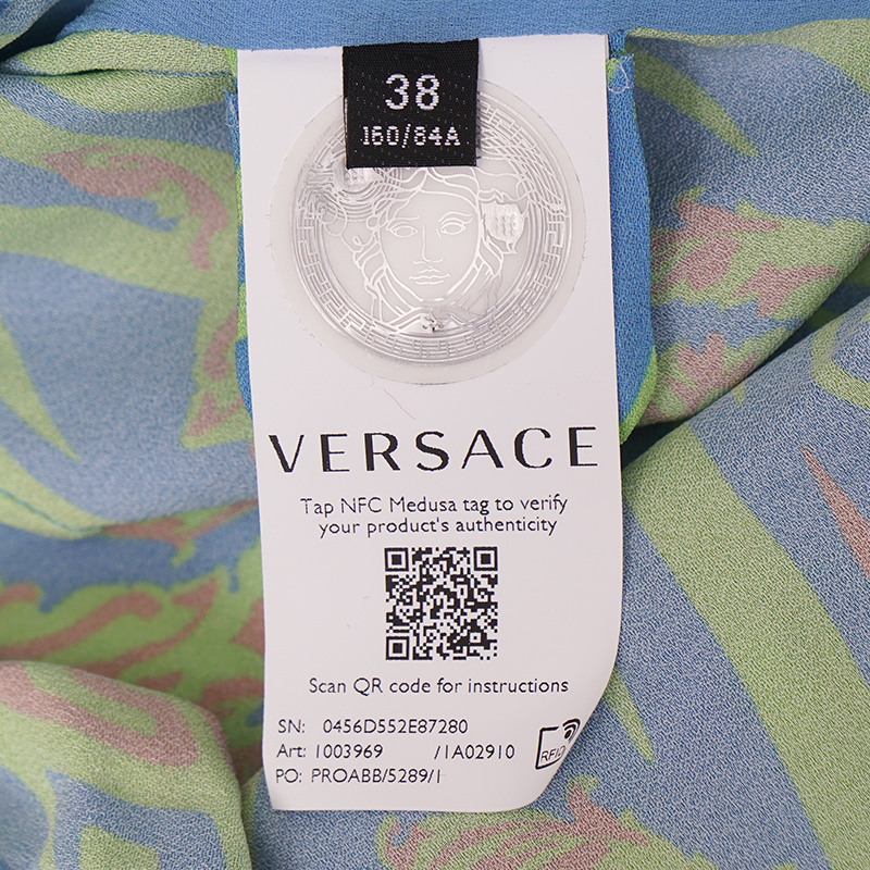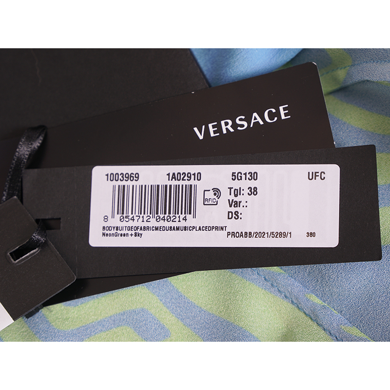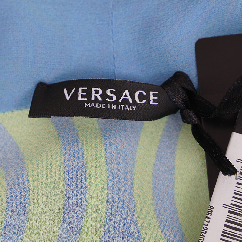 Authentic Versace bodysuit top from the 70's style music collection. Medusa Music print – a play on the psychedelic art style of the 70s. Teal blue, neon green and pastel pink. Stretch nylon jersey and silk. Split neckline with button closures (allows you to adjust how deep you want the V opening). Long sleeves. Large Medusa logo in back. Adjustable hook and eye gusset. 96% viscose, 4% elastane, Lining: 87% silk, 9% polyamide, 4% elastane. Gusset: 92% cotton, 8% elastane. Style 1003969. Made in Italy. Pair with everything to jeans to skrits. Sure to get noticed.