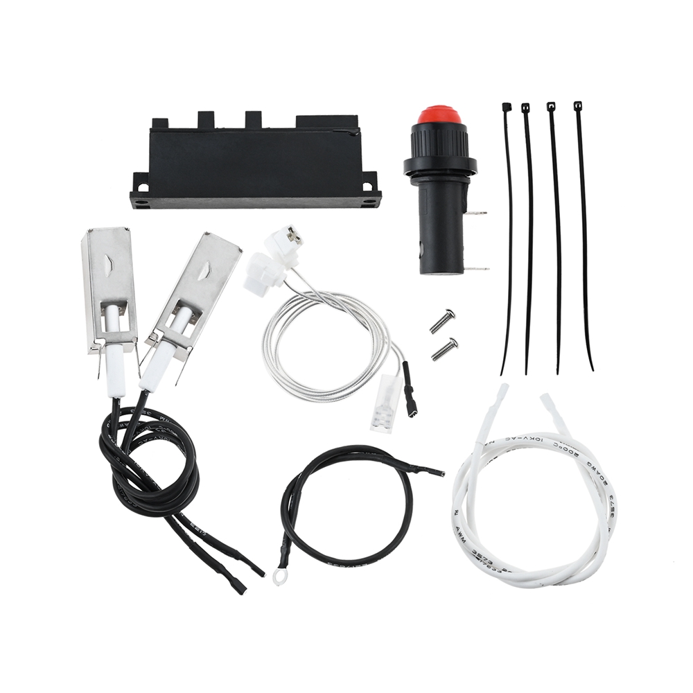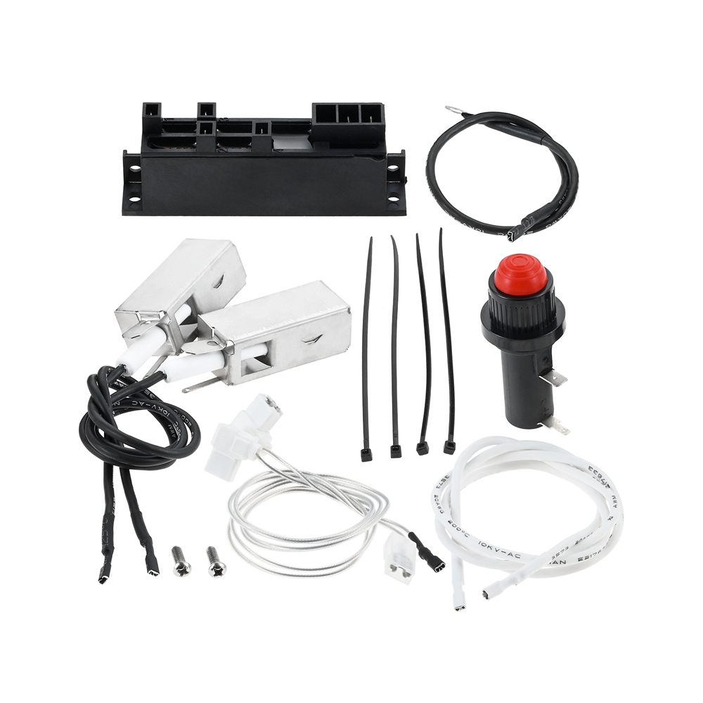 2.INCLUDE: Igniter kit includes push button, electronic igniter, wire with terminals, 2pcs ceramic electrodes with collector box, zip ties, connecting wires and mounting screws.