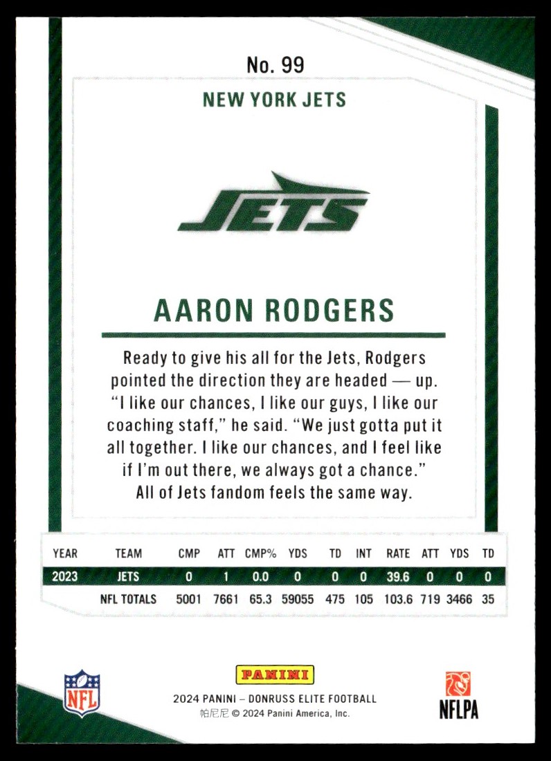 | 2024 Donruss Elite Base Aaron Rodgers New York Jets #99 | ||||||||||||||||||