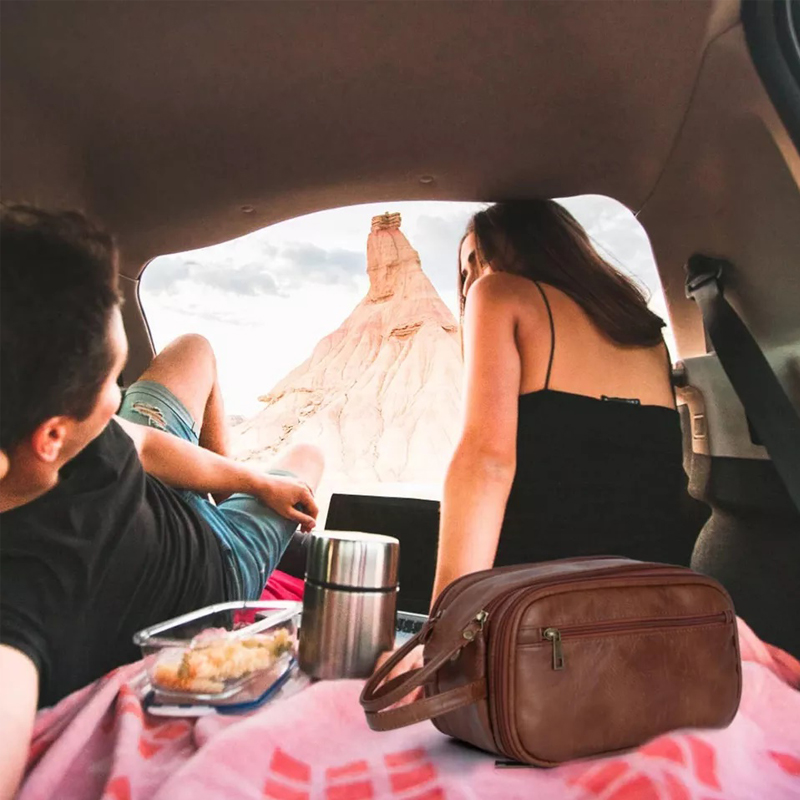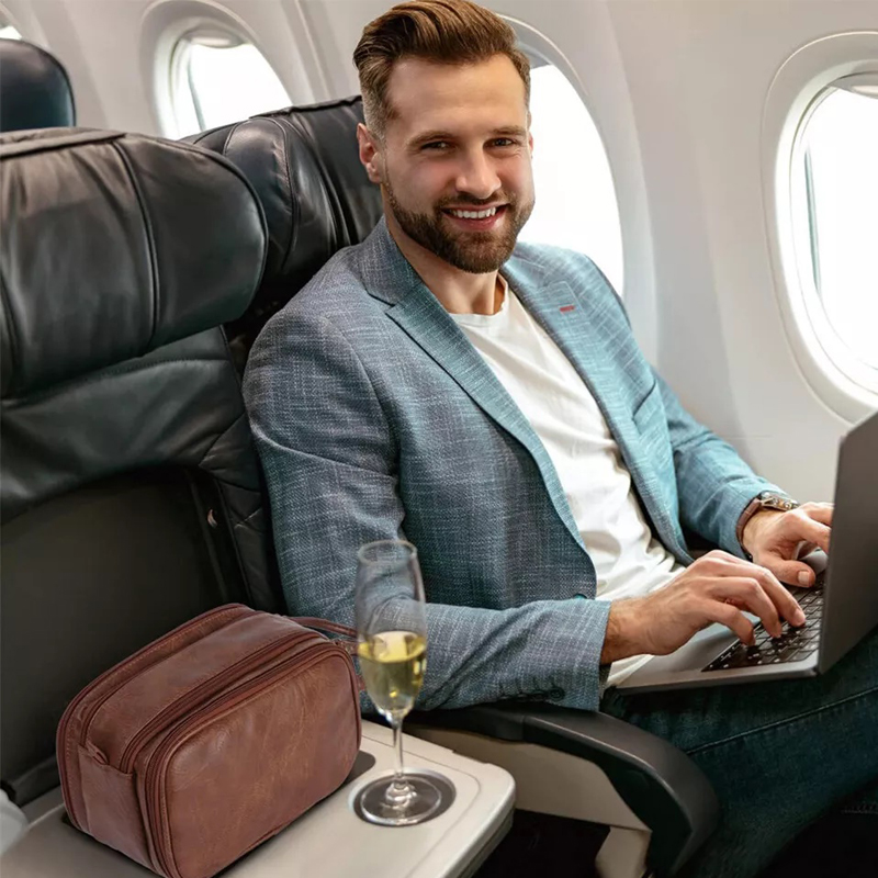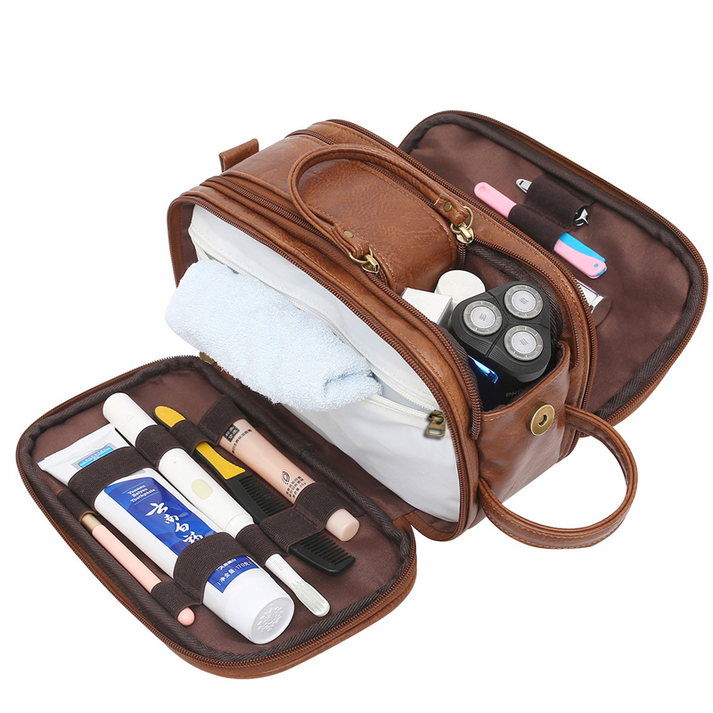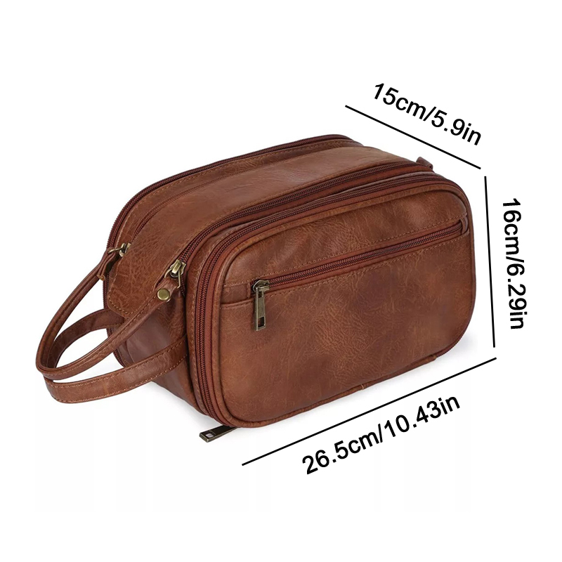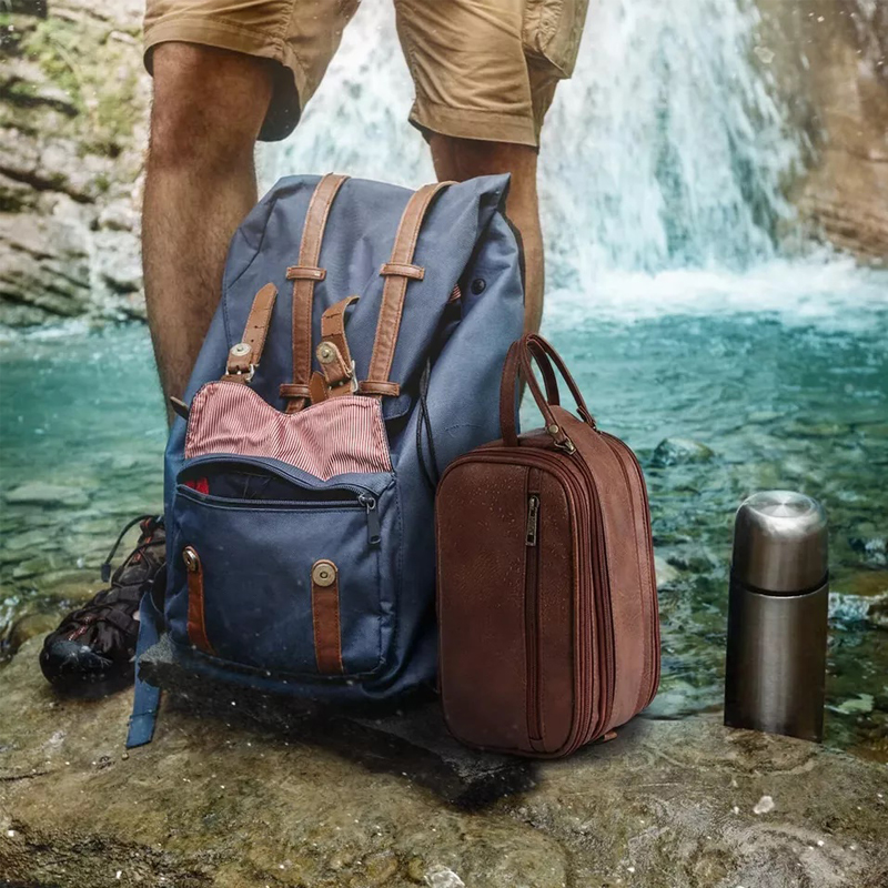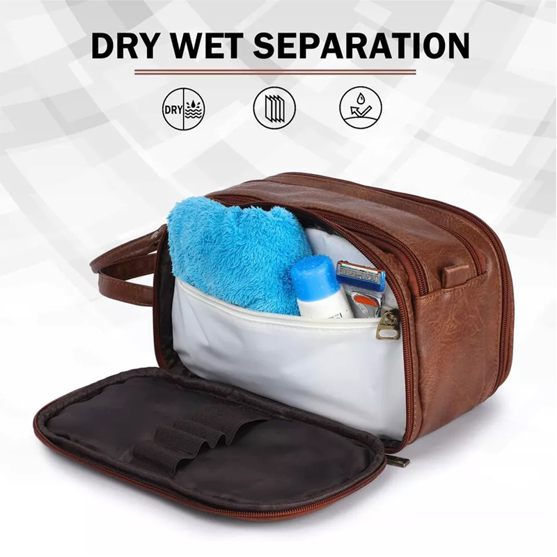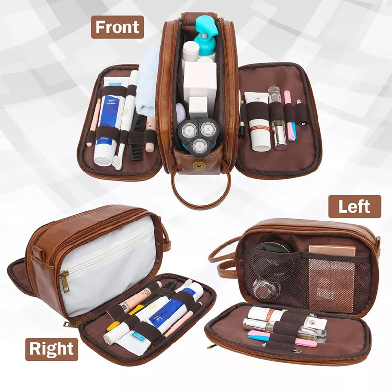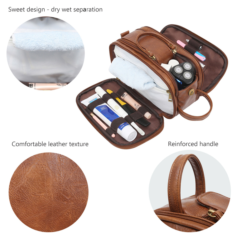 1.Material : We use leather, soft to the touch, not only does it look classic, we also tried and tested its durablilty for this kit. It's easy to clean, despite what you might sprinkle on it. it will always keep you looking fresh and professional. Waterproof lining inside, no need to worry when carrying liquids or shaving, just wipe, wash and your men's vanity case will work again.