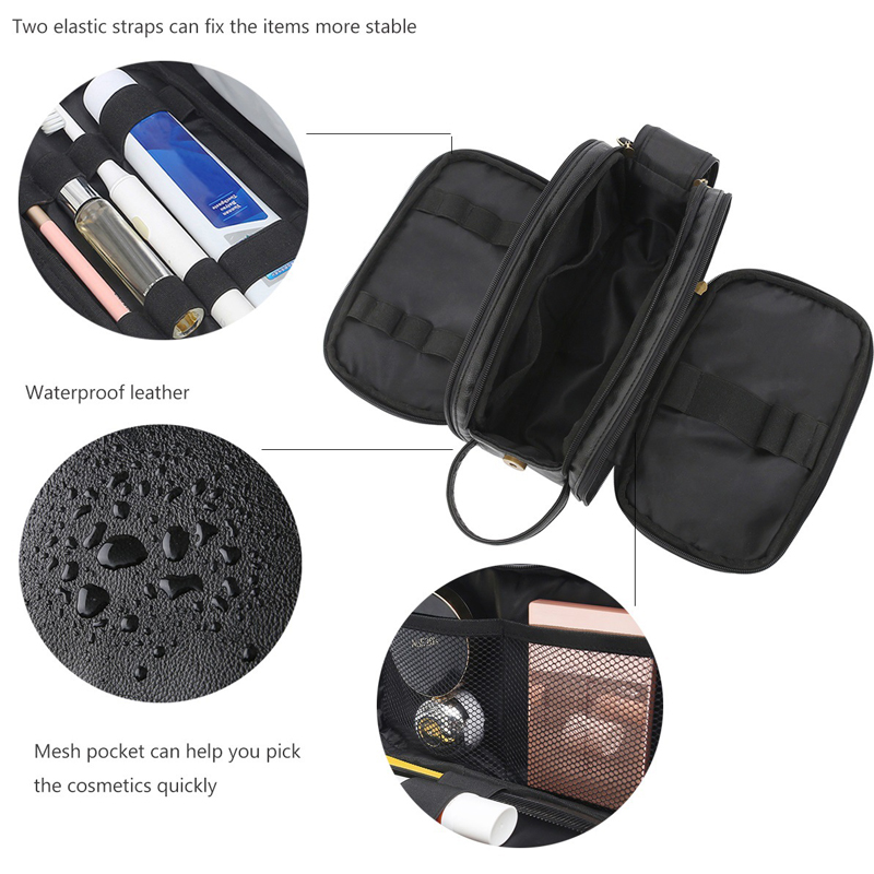 Toiletries bag can be opened on both sides and top, with pocket and elastic straps inside on one side, mesh pocket and elastic straps inside on other side, open top and large interior space, which is convenient for storing various items.