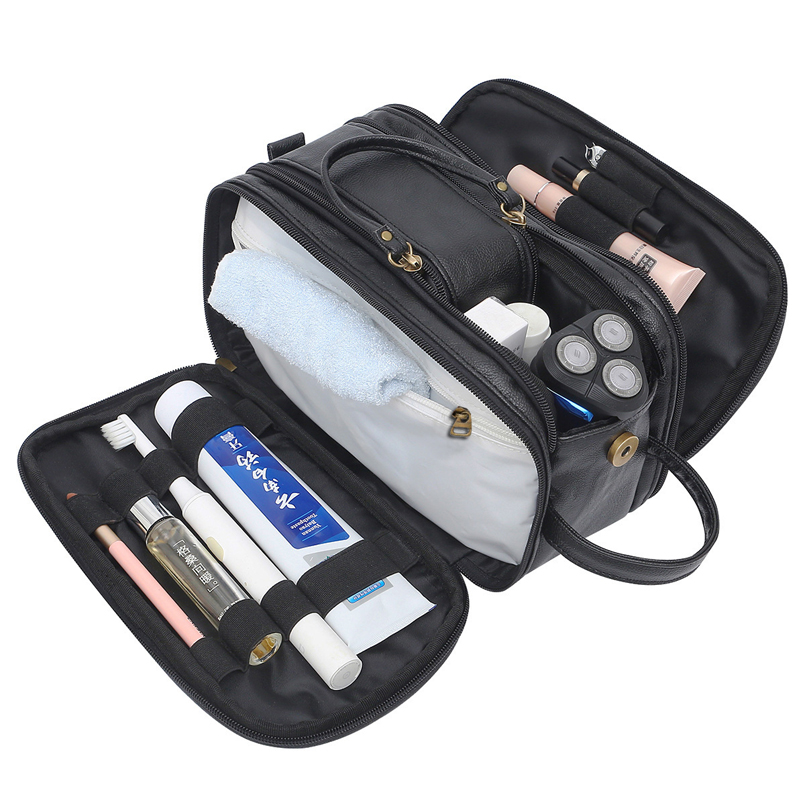 The toiletries bag is easy to carry thanks to the side handle.