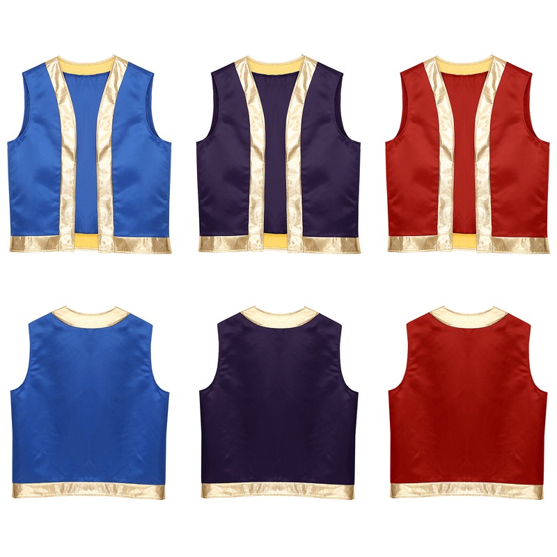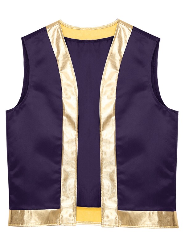 Designed with open front, sleeveless, stylish metallic shiny trim and loose fitting, contrast vest is a perfect costume for cospaly party.