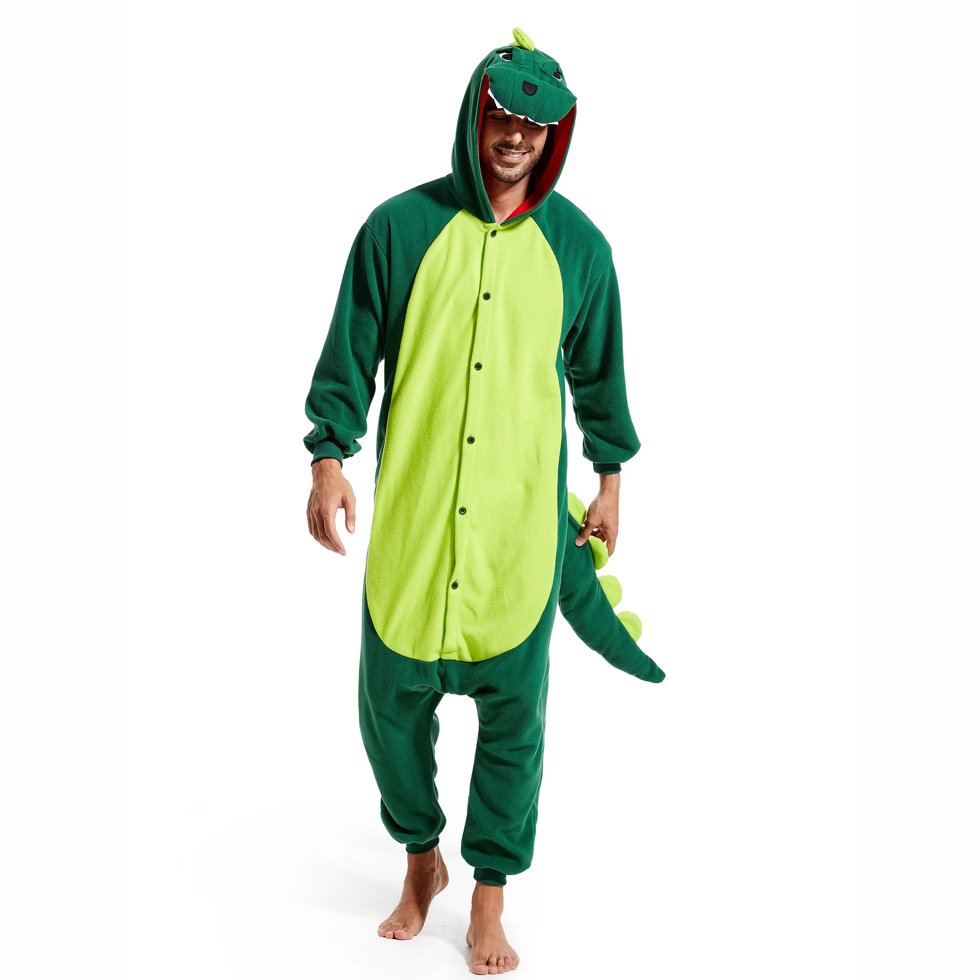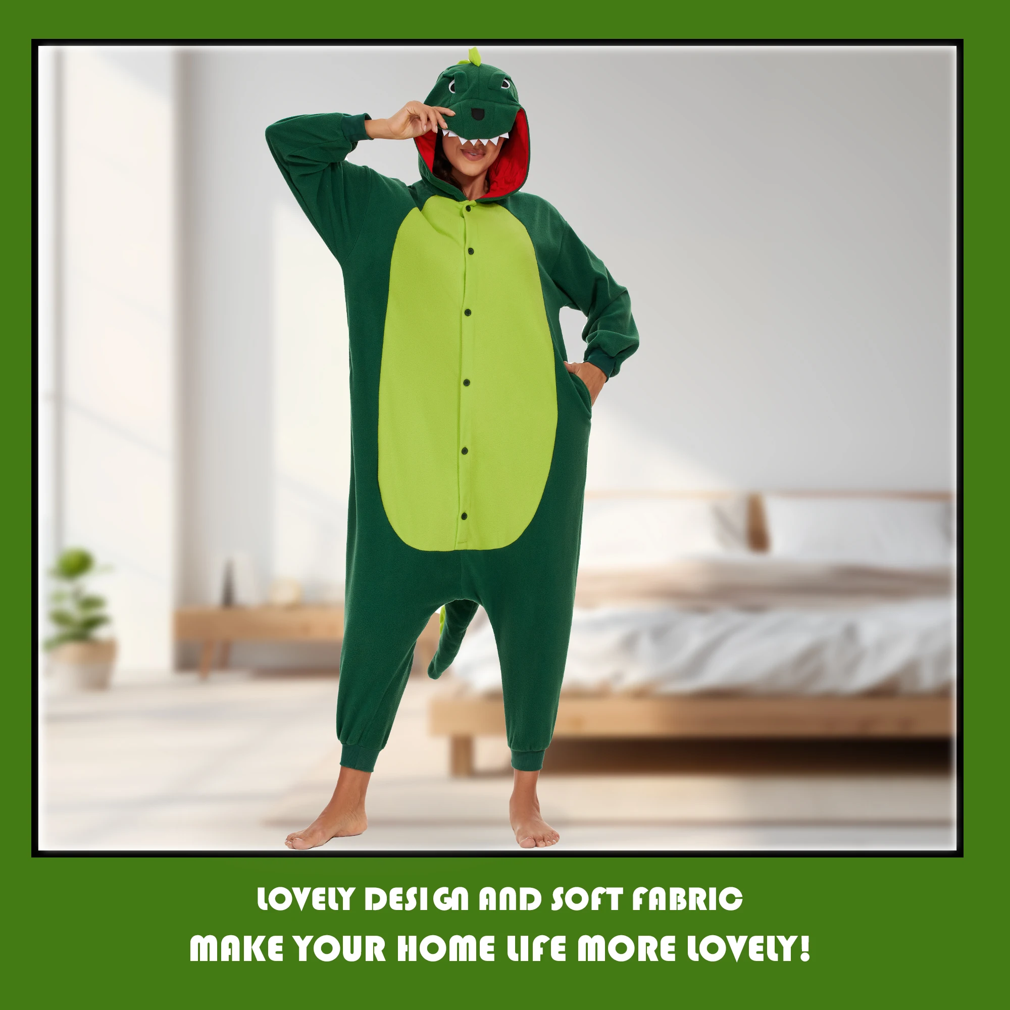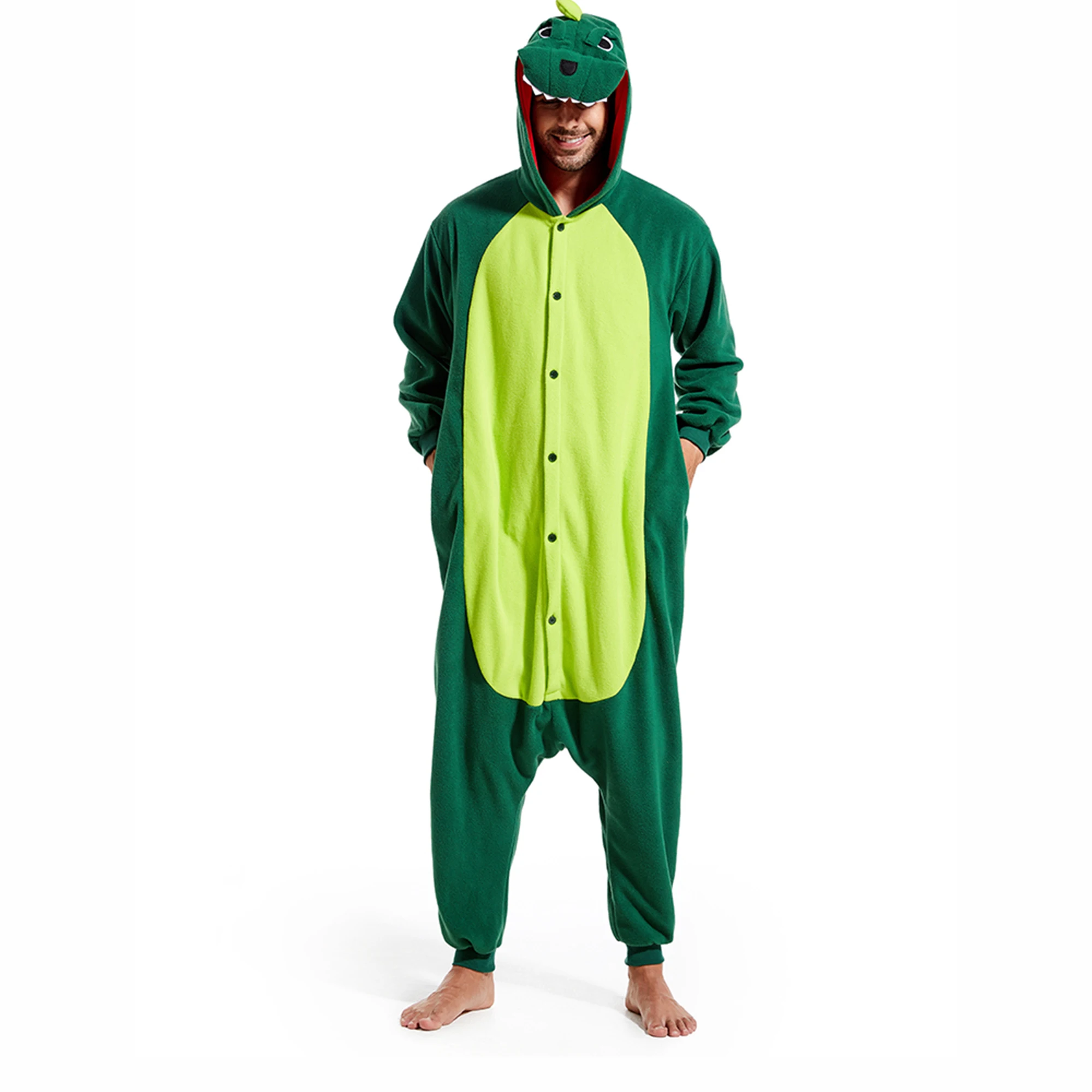 On chilly winter evenings,our green dinosaur onesie adult women provide extra warmth and coziness.Whether watching a movie, reading a book, or simply relaxing in bed,the material keeps one comfortably warm.