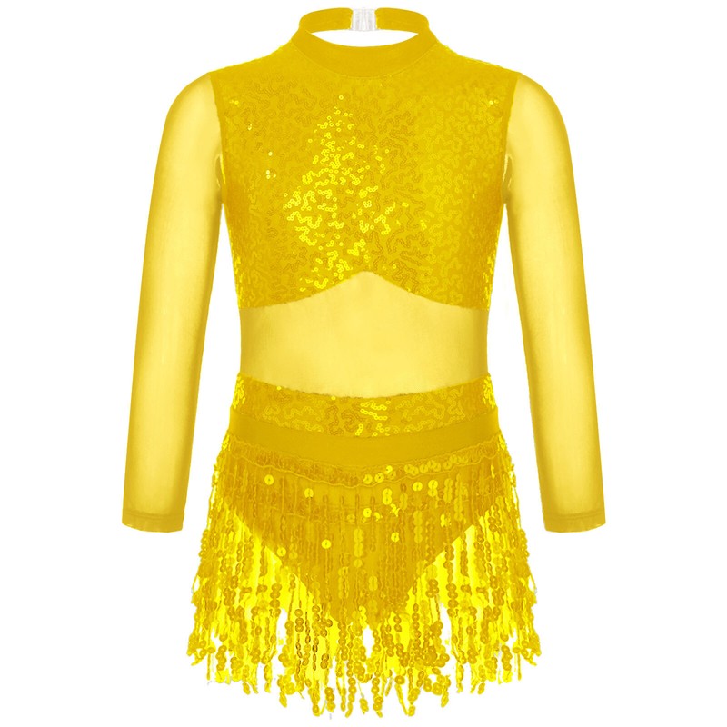 The dress with spandex mesh long sleeve and round collar, shiny sequins decorated, big hollow back.