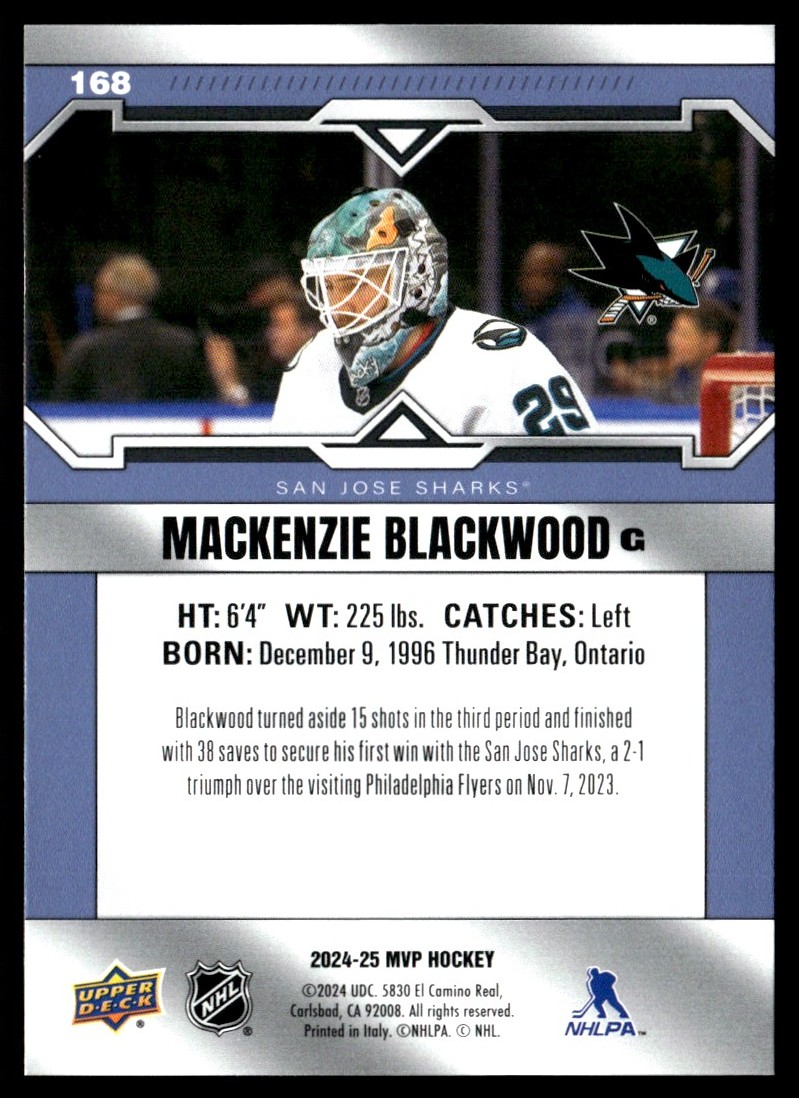 | 2024-25 Upper Deck MVP Base Mackenzie Blackwood San Jose Sharks #168 | ||||||||||||||||||