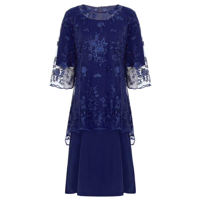 Two-piece set includes tube dress and lace cover up top. Tube dress designs with half sleeve, knee length and back zipper closure.