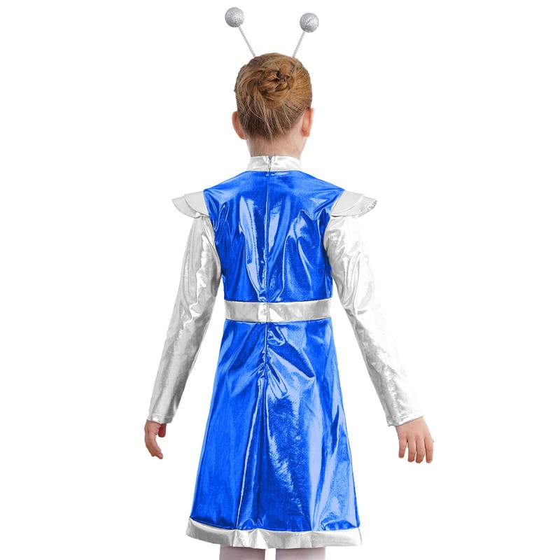 Alien cosplay costume for child size, designed with mock neck, long sleeve, shoulder pads, high waist a-line dress.