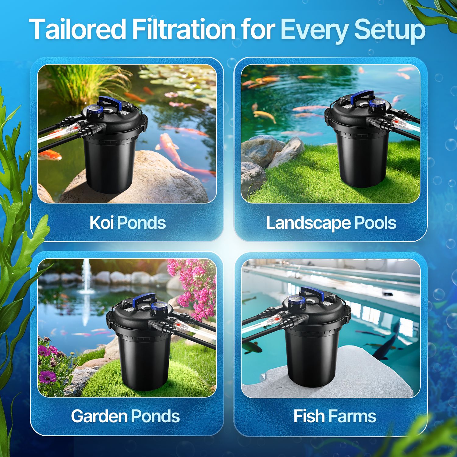 If you have a Koi pond in your garden or would like to start one, or if your goal is to build an appealing water feature like a fountain, an ornamental pond filter with UV clarifier is a must-have. Our koi fish pond filter will ensure that the pond's water remains clean, allowing your fish and plants to flourish in a healthy, balanced ecosystem. This UV pond filter facilitates the maintenance of a beautiful aquatic environment by removing dirty water, filtering it through a specially designed filtration system, and returning clean water to the pond. The result is a vibrant pond and a flourishing aquatic sanctuary.Feature: