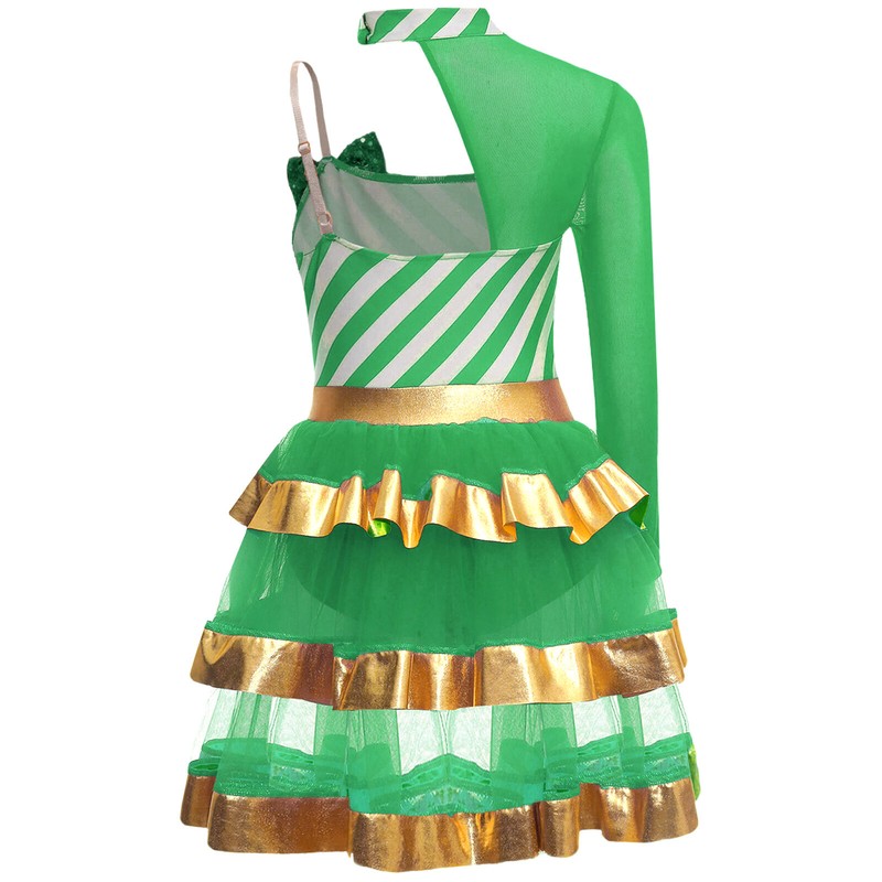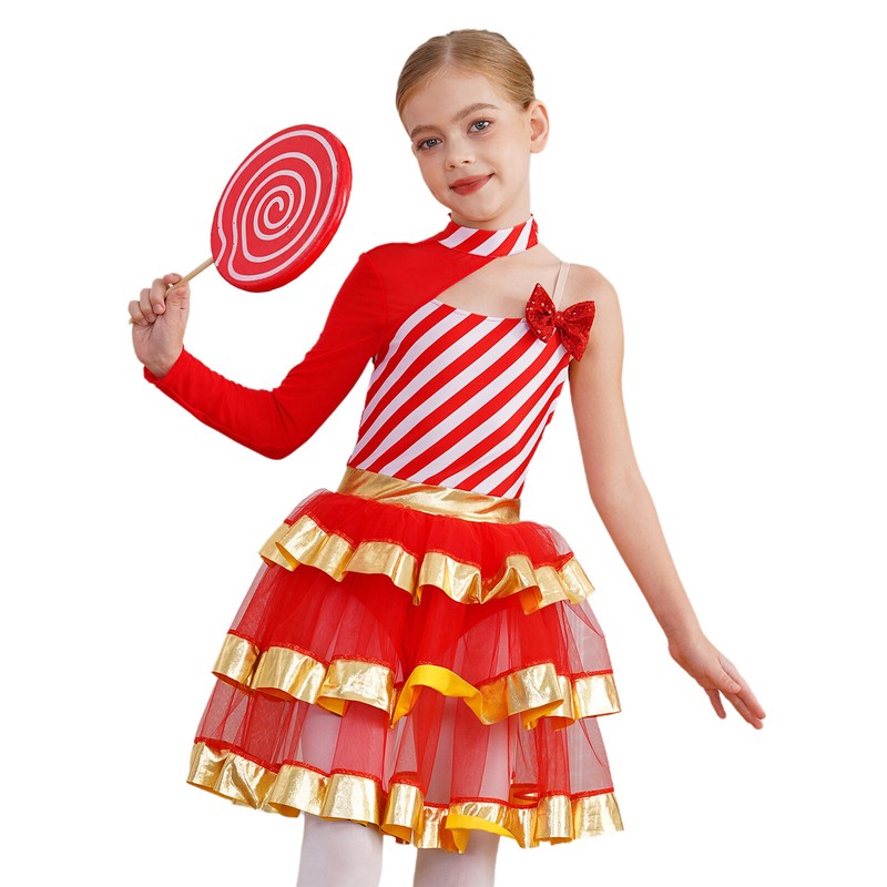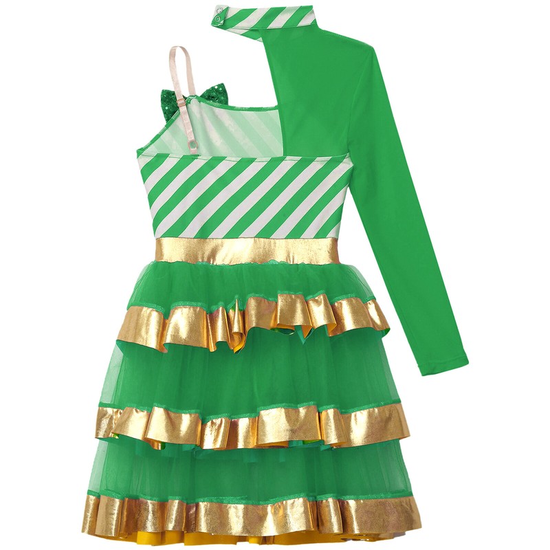 Asymmetrical shoulder designed high waist tiered tutu dress for girl, fits special day of christmas.