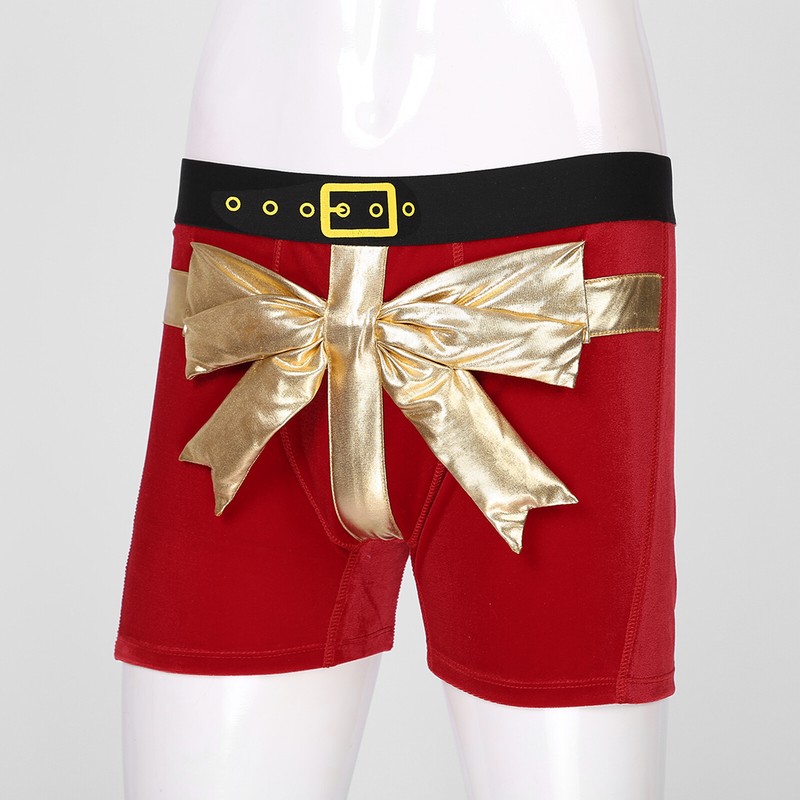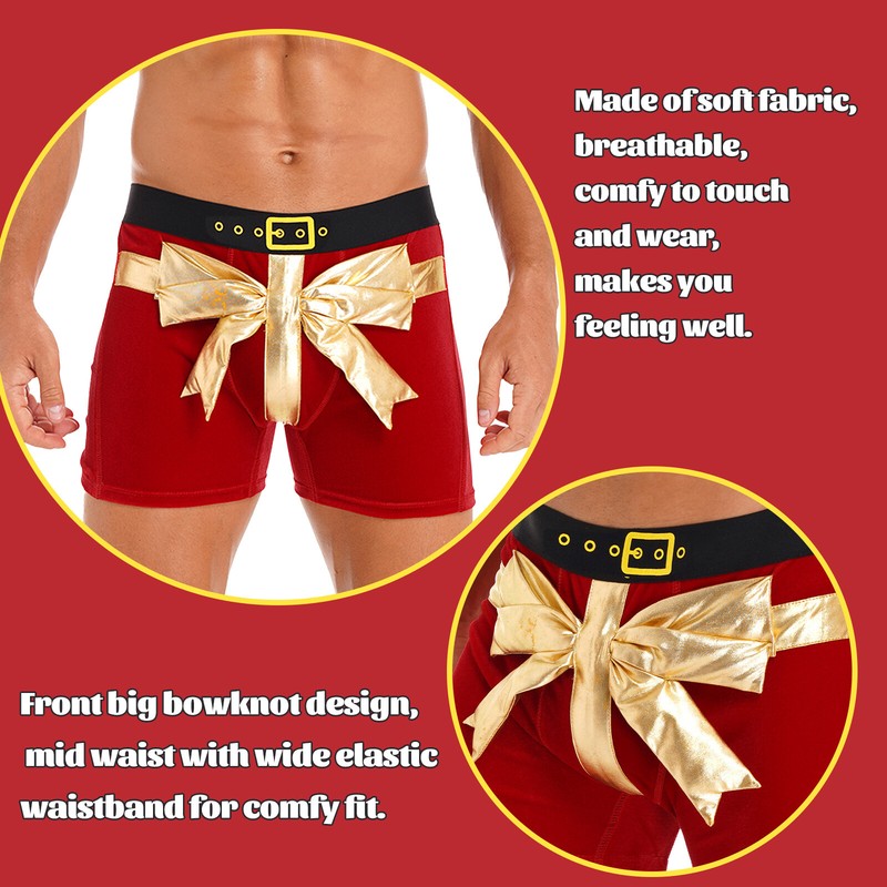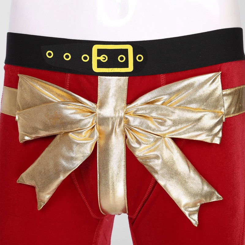 Mens Christmas Costume Bowknot Velvet Boxer Brief Wide Elastic Waistband Shorts.