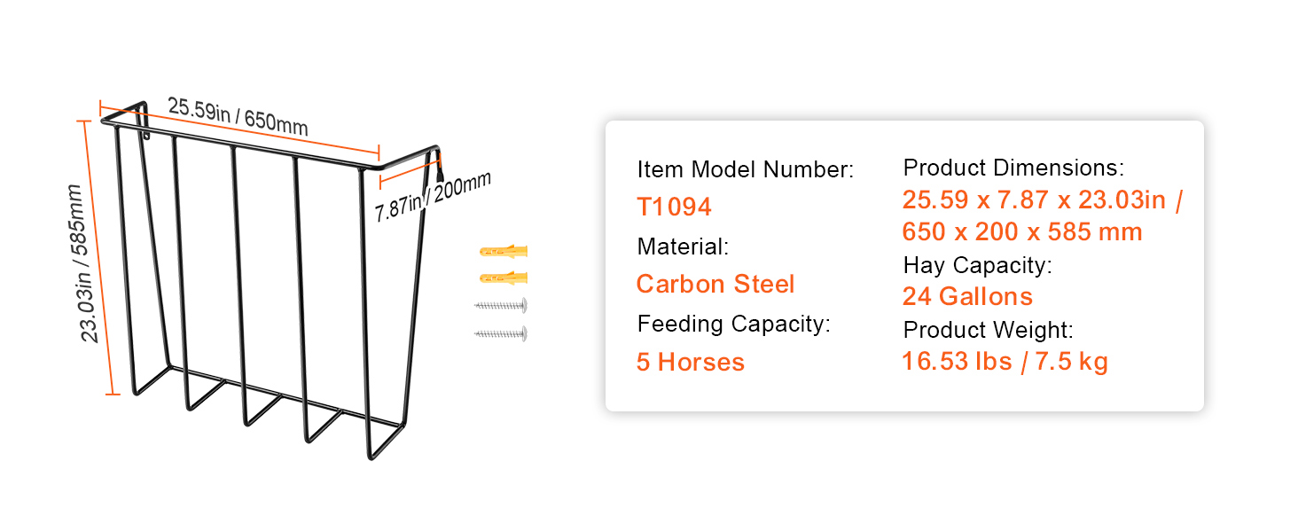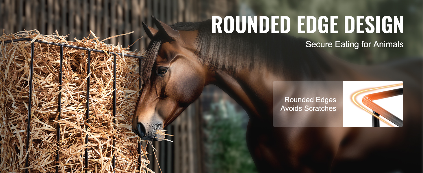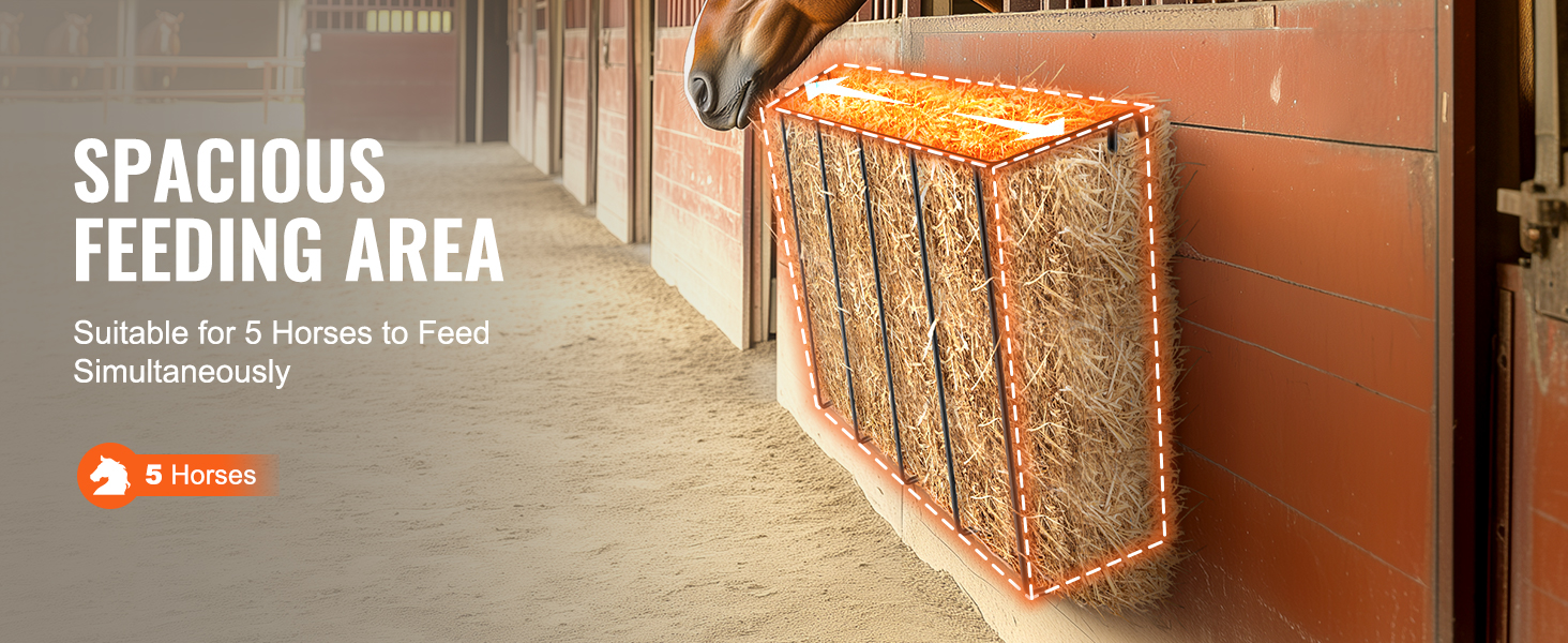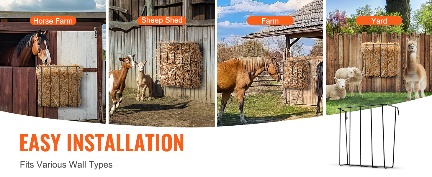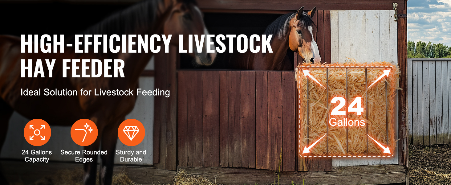 This wall-mounted hay feeder combines 24 gallons, heavy-duty steel, and a rounded-edge design that is suitable for feeding up to 5 horses at once and easily mounts to a variety of walls. The full weld process and powder coating ensure durability, and the wall-mounted design for multiple scenarios.