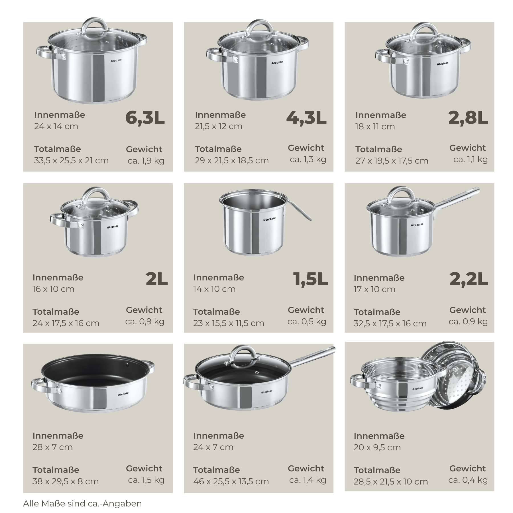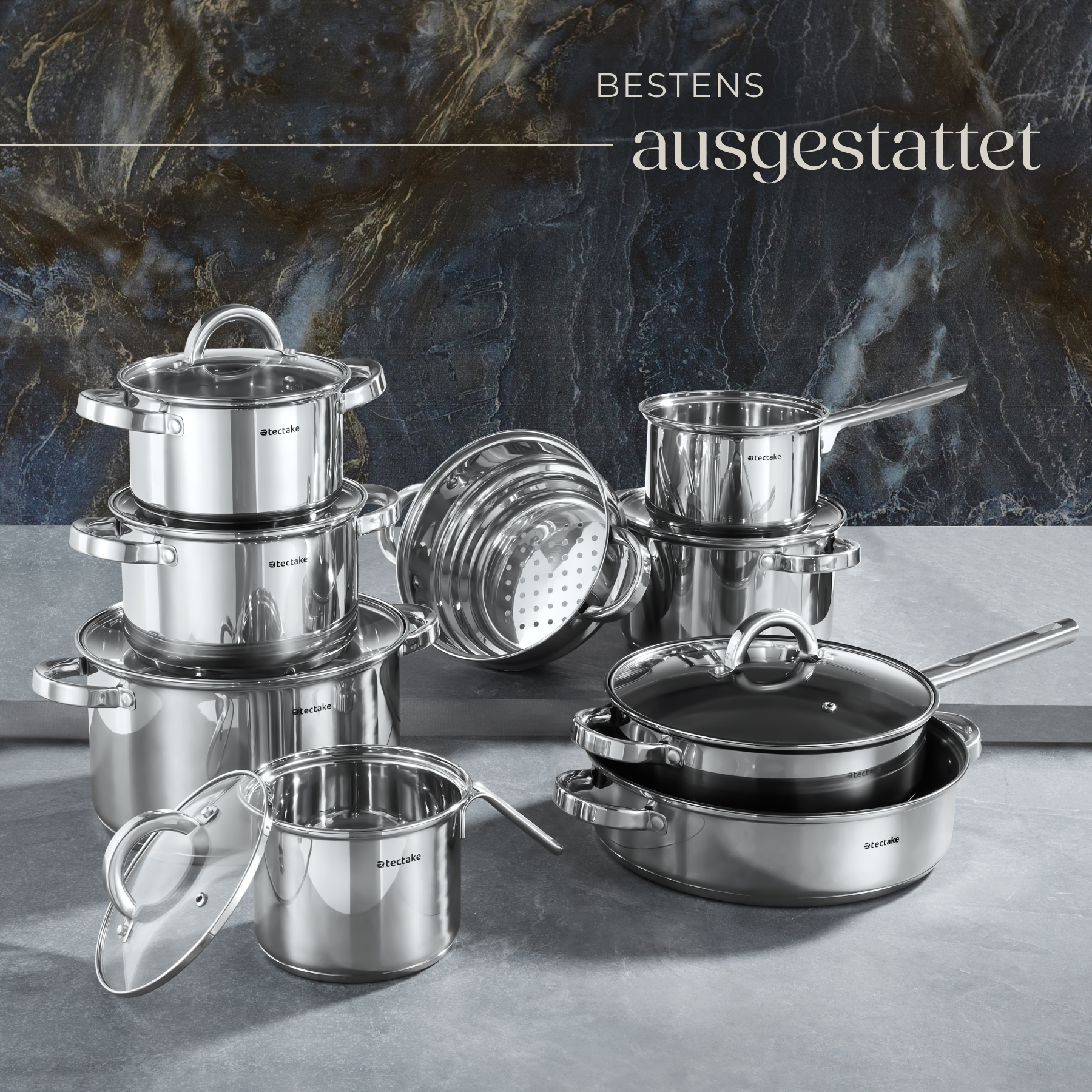 - 15-teiliges Set mit Kochtöpfen, Pfannen, Dampfgartopf, Milchtopf und zugehörigen Deckeln